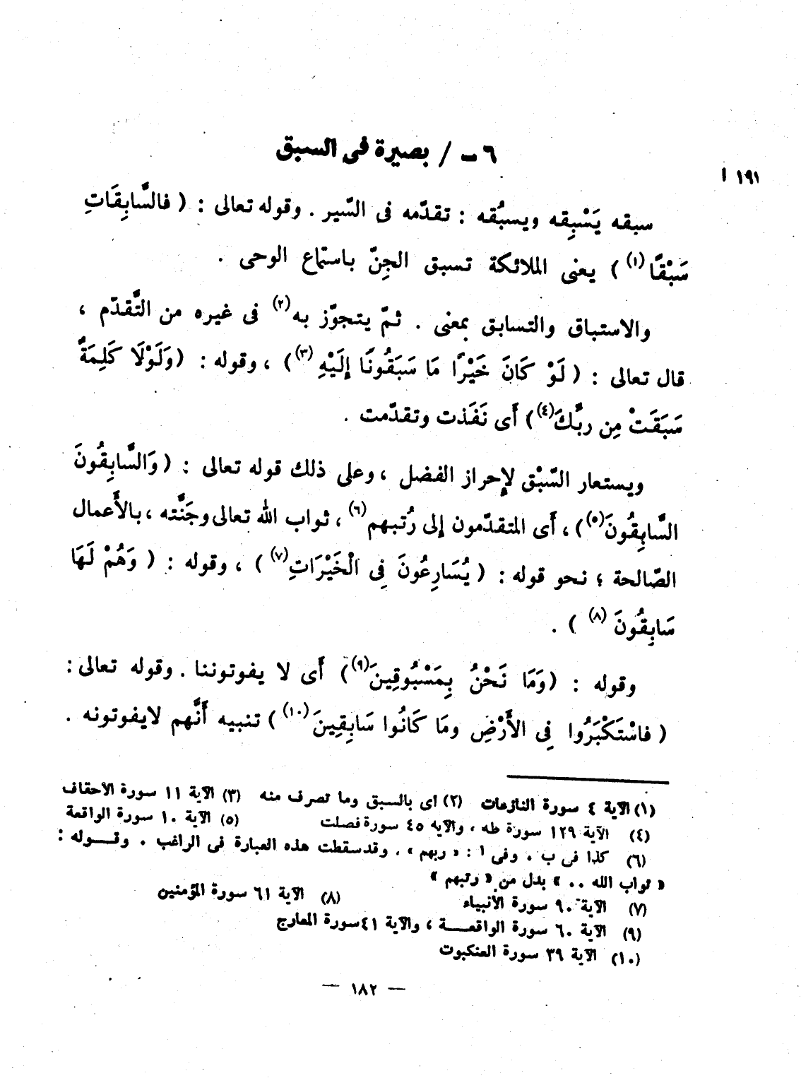 والاستباق والتسابق بمعنى. ثمّ يتجوّز به فى غيره من التَّقدّم، قال تعالى: {لَوْ كَانَ خَيْراً مَّا سَبَقُونَآ إِلَيْهِ} ، وقوله: {وَلَوْلاَ كَلِمَةٌ سَبَقَتْ مِن رَّبِّكَ} أَى نَفَذت وتقدّمت.