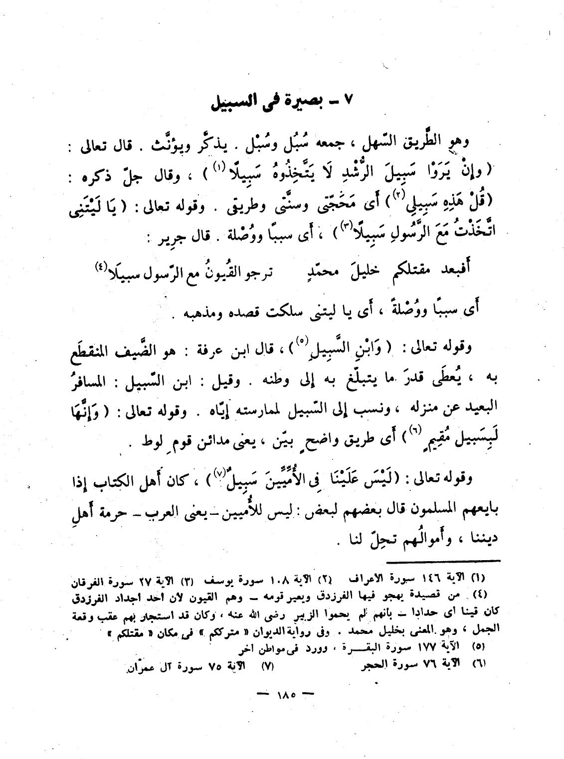 وهو الطَّريق السّهل، جمعه سُبُل وسُبْل. يذكَّر ويؤنَّث. قال تعالى: {وَإِن يَرَوْاْ سَبِيلَ الرشد لاَ يَتَّخِذُوهُ سَبِيلاً} ، وقال جلّ ذكره: {قُلْ هاذه سبيلي} أَى مَحَجّتى وسنَّتى وطريقى. وقوله تعالى: {ياليتني اتخذت مَعَ الرسول سَبِيلاً} ، أَى سببًا ووُصْلة. قال جرير: