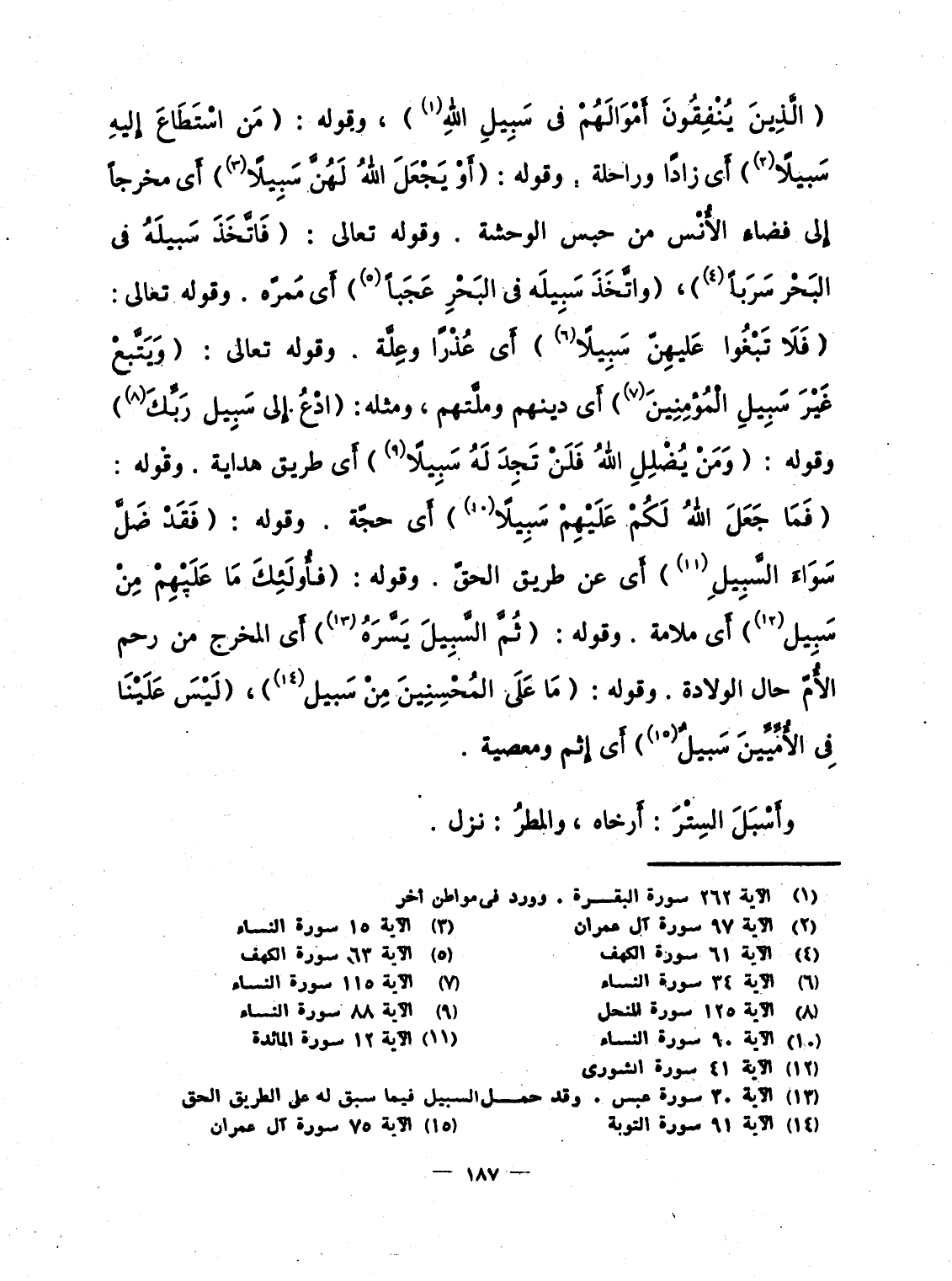 {الذين يُنْفِقُونَ أَمْوَالَهُمْ فِي سَبِيلِ الله} ، وقوله: {مَنِ استطاع إِلَيْهِ سَبِيلاً} أَى زادًا وراحلة. وقوله: {أَوْ يَجْعَلَ الله لَهُنَّ سَبِيلاً} أَى مخرجاً إِلى فضاءِ الأُنْس من حبس الوحشة. وقوله تعالى: {فاتخذ سَبِيلَهُ فِي البحر سَرَباً} ، {واتخذ سَبِيلَهُ فِي البحر عَجَباً} أَى مَمرّه. وقوله تعالى: {فَلاَ تَبْغُواْ عَلَيْهِنَّ سَبِيلاً} أَى عُذْرًا وعِلَّة. وقوله تعالى: {وَيَتَّبِعْ غَيْرَ سَبِيلِ المؤمنين} أَى دينهم وملَّتهم، ومثله: {ادع إلى سَبِيلِ رَبِّكَ} وقوله: {وَمَن يُضْلِلِ الله فَلَن تَجِدَ لَهُ سَبِيلاً} أَى طريق هداية. وقوله: {فَمَا جَعَلَ الله لَكُمْ عَلَيْهِمْ سَبِيلاً} أَى حجّة. وقوله: {فَقَدْ ضَلَّ سَوَآءَ السبيل} أَى عن طريق الحقّ. وقوله: {فأولائك مَا عَلَيْهِمْ مِّن سَبِيلٍ} أَى ملامة. وقوله: {ثُمَّ السبيل يَسَّرَهُ} أَى المخرج من رحم الأُمّ حال الولادة. وقوله: {مَا عَلَى المحسنين مِن سَبِيلٍ} ، {لَيْسَ عَلَيْنَا فِي الأميين سَبِيلٌ} أَى إِثم ومعصية.