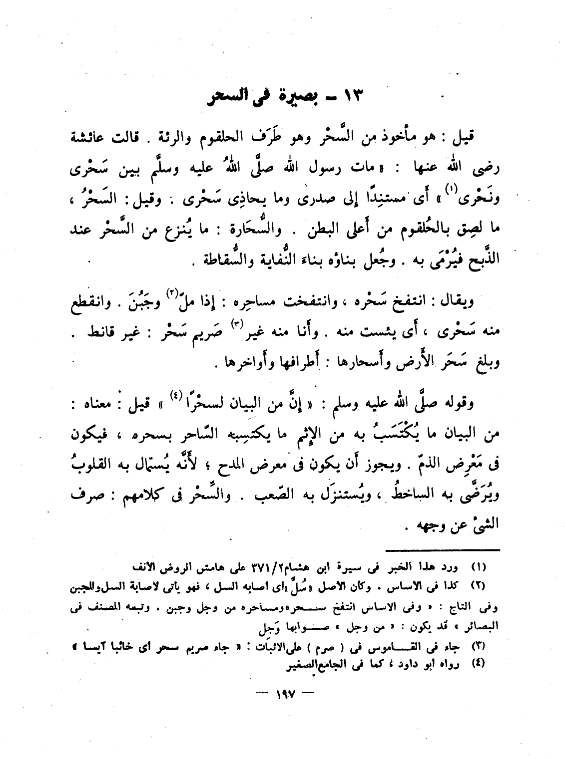 وقوله صلَّى الله عليه وسلم: "إِنَّ من البيان لسحْرًا" قيل: معناه: من البيان ما يُكْتَسَبُ به من الإِثم ما يكتسِبه السّاحر بسحره، فيكون فى مَعْرِض الذمّ. ويجوز أَن يكون فى معرض المدح؛ لأَنَّه يُستمال به القلوبُ ويُرَضَّى به الساخطُ، ويُستنزَل به الصّعب. والسِّحْر فى كلامهم: صرف الشىء عن وجهه.