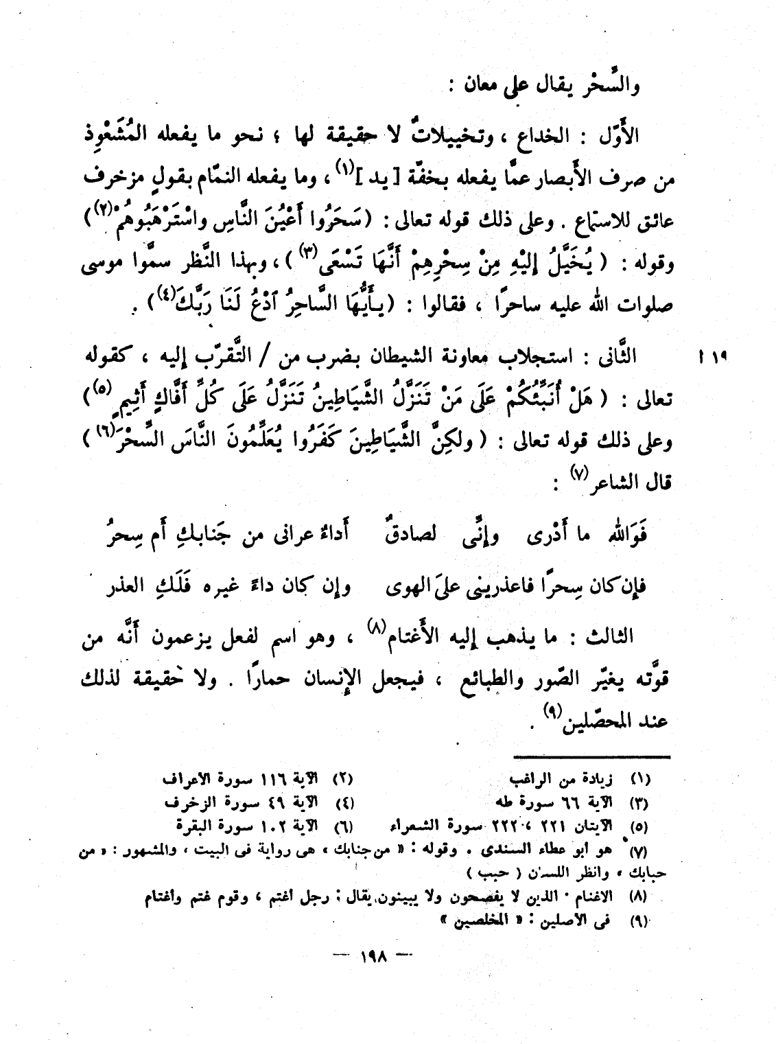 الأَوّل: الخداع، وتخييلاتٌ لا حقيقة لها؛ نحو ما يفعله المُشَعْوِذ من صرف الأَبصار عمَّا يفعله بخفّة [يد] ، وما يفعله النمّام بقولٍ مزخرف عائق للاستماع. وعلى ذلك قوله تعالى: {سحروا أَعْيُنَ الناس واسترهبوهم} وقوله: {يُخَيَّلُ إِلَيْهِ مِن سِحْرِهِمْ أَنَّهَا تسعى} ، وبهذا النَّظر سمَّوا موسى صلوات الله عليه ساحرًا، فقالوا: {ياأيه الساحر ادع لَنَا رَبَّكَ}