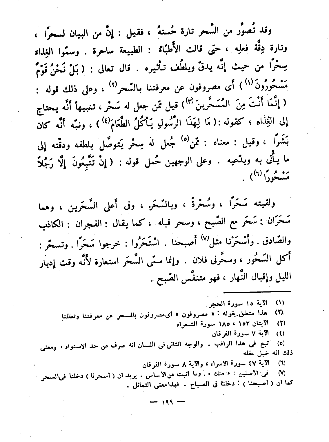 وقد تُصوِّر من السِّحر تارة حُسنهُ، فقيل: إِنَّ من البيان لسحرًا، وتارة دِقَّة فعلِه، حتى قالت الأَطبّاءُ: الطبيعة ساحرة. وسمّوا الغِذاءَ سِحْرًا من حيث إِنَّه يدقّ ويلطُف تأثيره. قال تعالى: {بَلْ نَحْنُ قَوْمٌ مَّسْحُورُونَ} أَى مصروفون عن معرفتنا بالسّحر، وعلى ذلك قوله: {إِنَّمَآ أَنتَ مِنَ المسحرين} قيل ممّن جعل له سَحْر، تنبيهاً أَنَّه يحتاج إِلى الغِذاءِ؛ كقوله: {مَالِ هاذا الرسول يَأْكُلُ الطعام} ، ونبّه أَنَّه كان بَشَرًا، وقيل: معناه: ممّن جُعل له سِحْر يَتوصَّل بلطفه ودقّته إِلى ما يأْتى به ويدّعيه. وعلى الوجهين حُمل قوله: {إِن تَتَّبِعُونَ إِلاَّ رَجُلاً مَّسْحُوراً} .