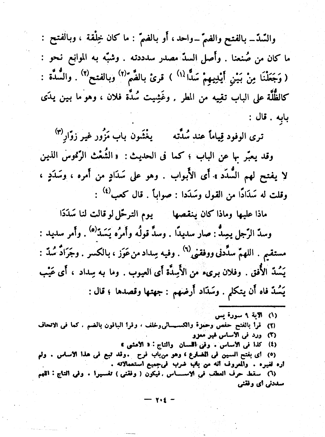 وقد يعبّر بها عن الباب؛ كما فى الحديث: "الشُعْث الرّؤس الذي لا يفتح لهم السُّدَد" أَى الأَبواب. وهو على سَدَادٍ من أَمره، وسَدَدٍ، وقلت له سَدَادًا من القول وسَدَدا: صواباً. قال كعب:
