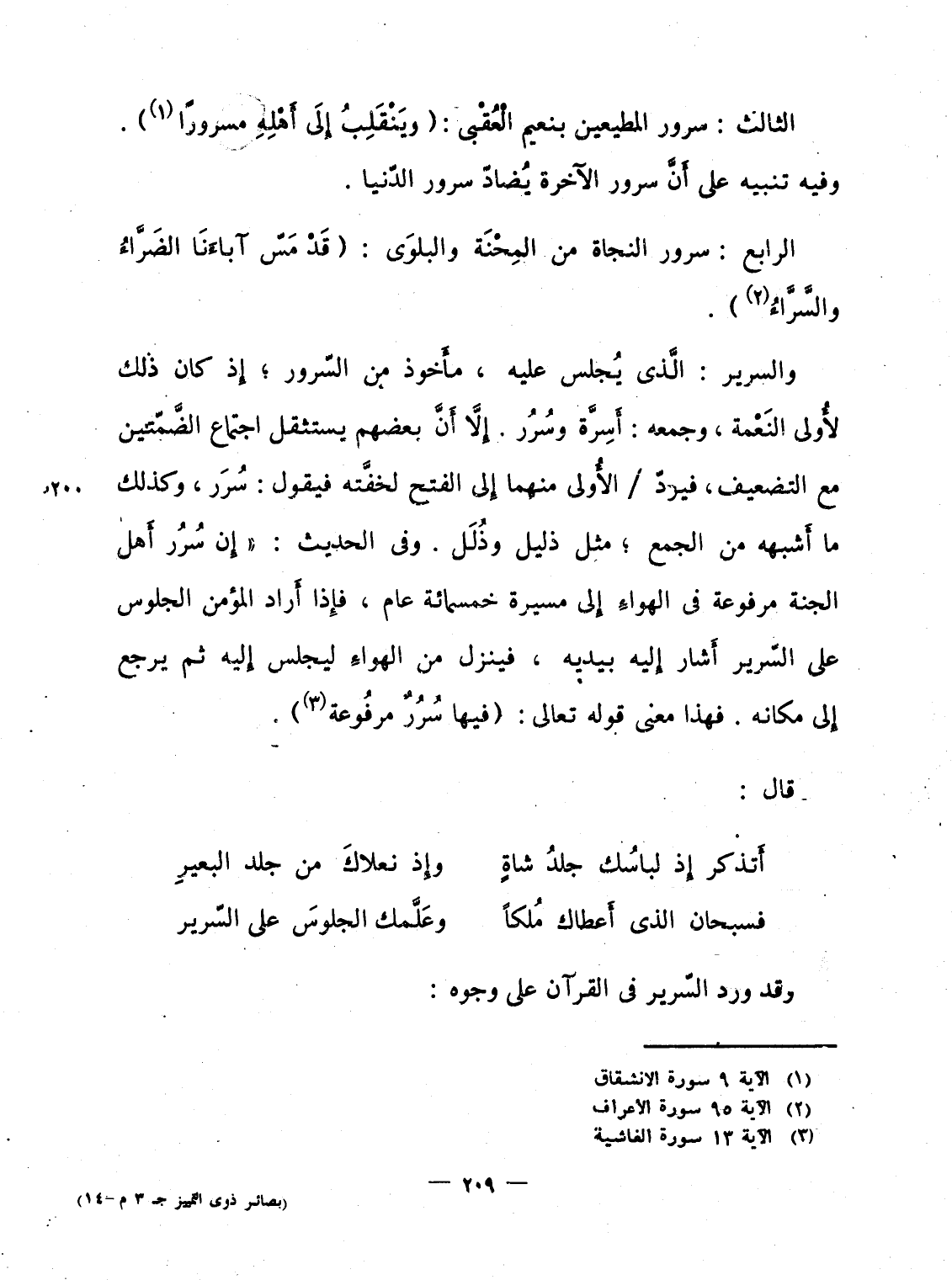 الثالث: سرور المطيعين بنعيم الْعُقْبى: {وَيَنقَلِبُ إلى أَهْلِهِ مَسْرُوراً} . وفيه تنبيه على أَنَّ سرور الآخرة يُضادّ سرور الدّنيا.
