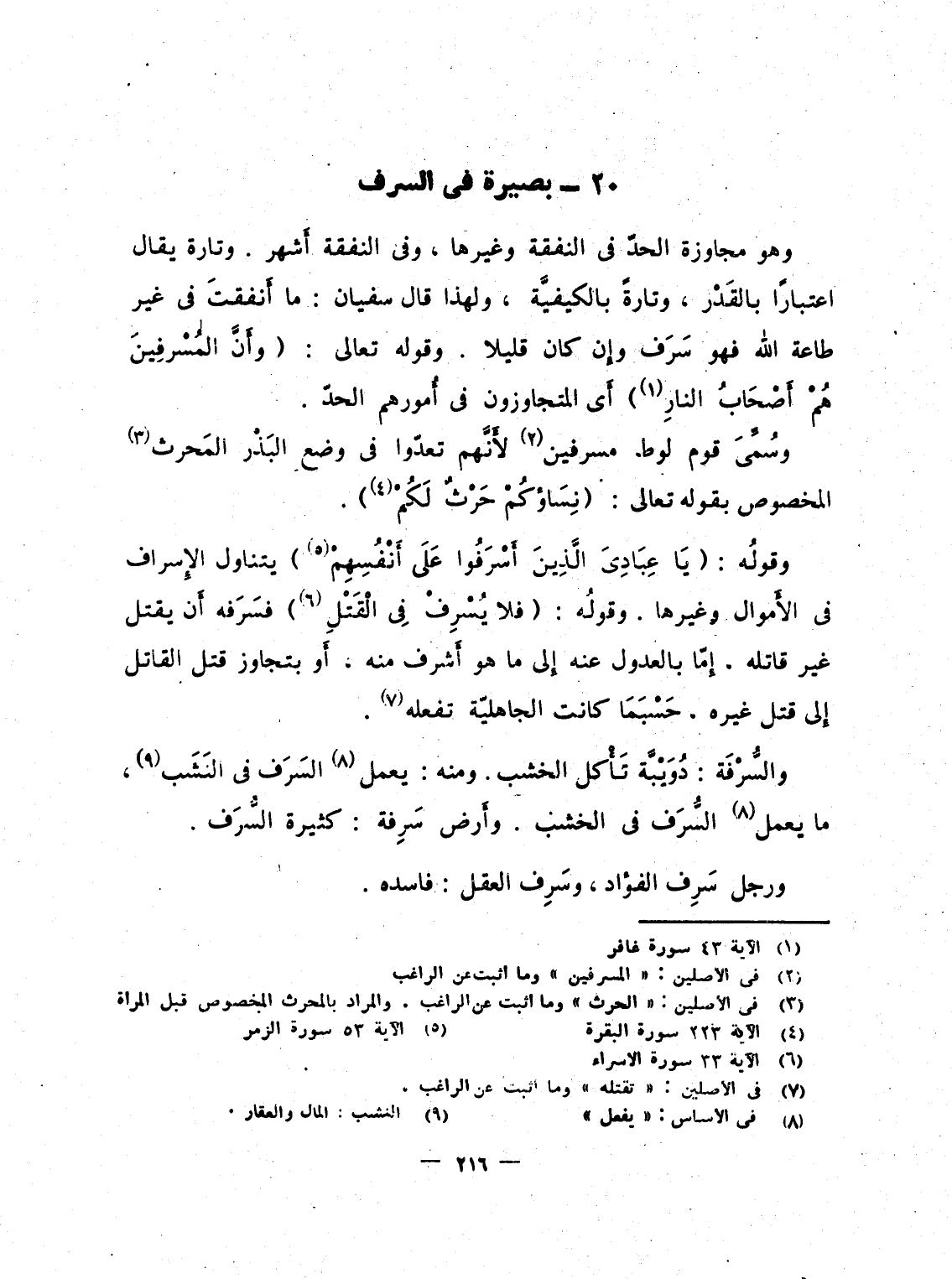 وهو مجاوزة الحدّ فى النفقة وغيره، وفى النفقة أَشهر. وتارة يقال اعتبارًا بالقَدْر، وتارةً بالكيفيَّة، ولهذا قال سفيان: ما أَنفقتَ فى غير طاعة الله فهو سَرَف وإِن كان قليلا. وقوله تعالى: {وَأَنَّ المسرفين هُمْ أَصْحَابُ النار} أَى المتجاوزون فى أُمورهم الحدّ.