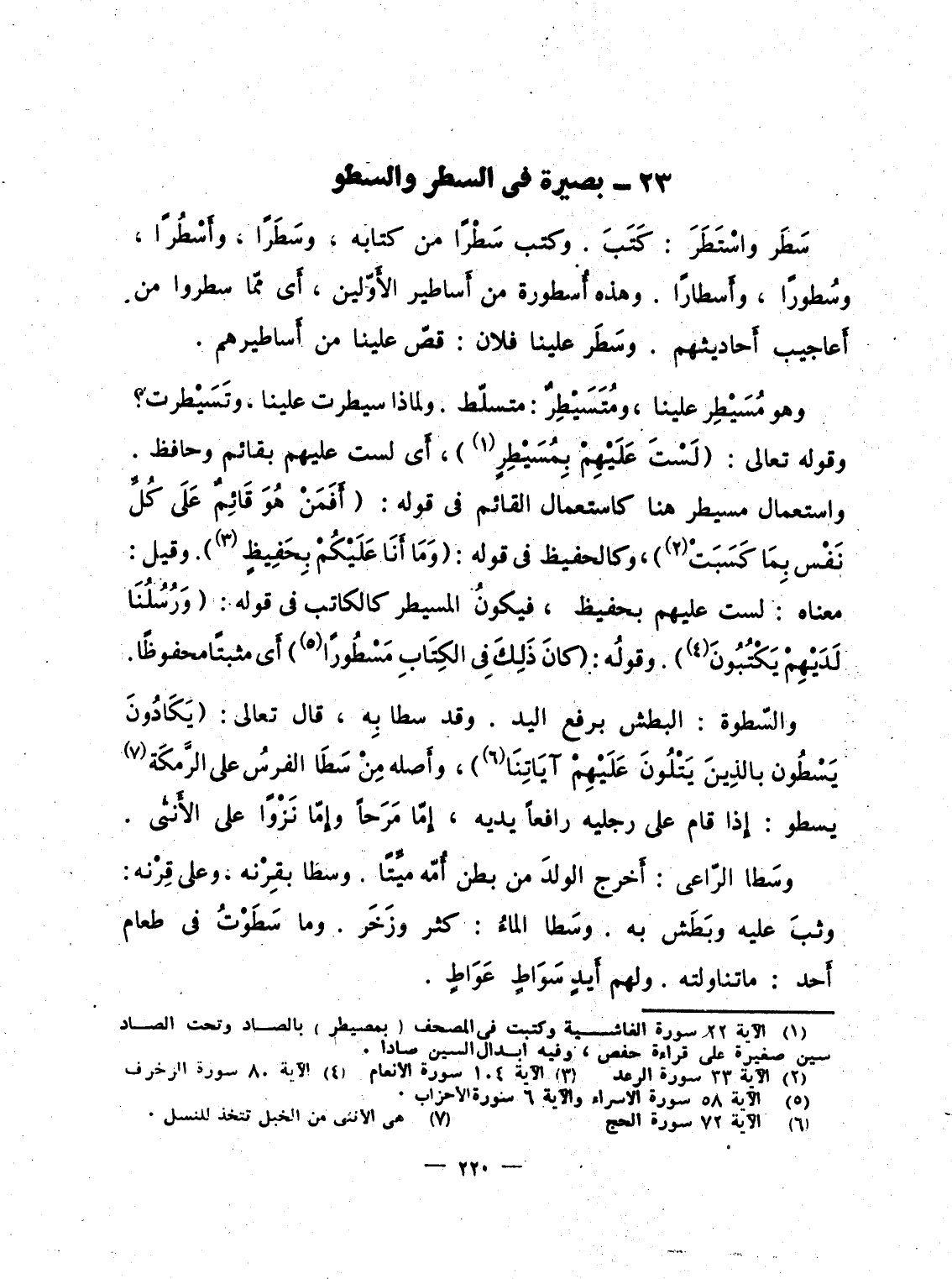 وهو مُسَيْطِر علينا، ومُتَسَيْطِرٌ: متسلّط. ولماذا سيطرت علينا، وتَسَيْطرت؟ وقوله تعالى: {لَّسْتَ عَلَيْهِم بِمُصَيْطِرٍ} ، أَى لست عليهم بقائم وحافظ. واستعمال مسيطر هنا كاستعمال القائم فى قوله: {أَفَمَنْ هُوَ قَآئِمٌ على كُلِّ نَفْسٍ بِمَا كَسَبَتْ} ، وكالحفيظ فى قوله: {وَمَآ أَنَاْ عَلَيْكُمْ بِحَفِيظٍ} . وقيل: معناه: لست عليهم بحفيظ، فيكونُ المسيطر كالكاتب فى قوله: {وَرُسُلُنَا لَدَيْهِمْ يَكْتُبُونَ} . وقولُه: {كَانَ ذلك فِي الكتاب مَسْطُوراً} أَى مثبتًا محفوظًا.