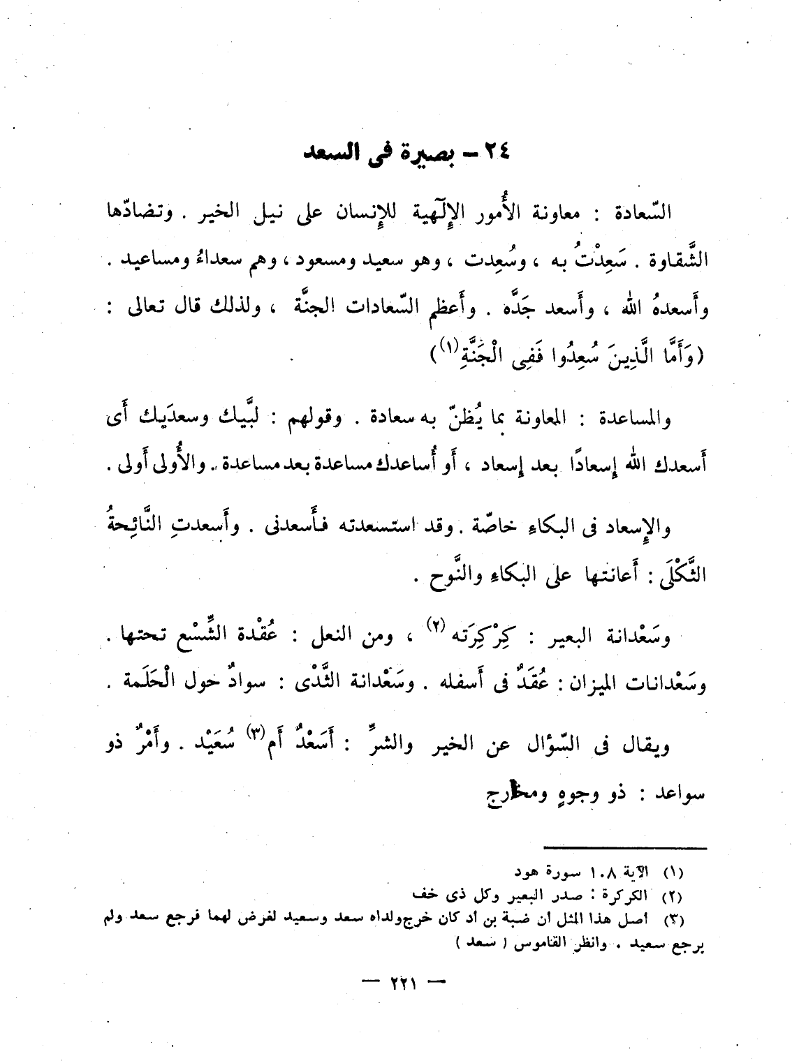 السّعادة: معاونة الأُمور الإِلَهية للإِنسان على نيل الخير. وتضادّها الشَّقاوة. سَعِدْتُ به، وسُعِدت، وهو سعيد ومسعود، وهم سعداءُ ومساعيد. وأَسعدهُ الله، وأَسعد جَدَّه. وأَعظم السّعادات الجنَّة، ولذلك قال تعالى: {وَأَمَّا الذين سُعِدُواْ فَفِي الجنة} .