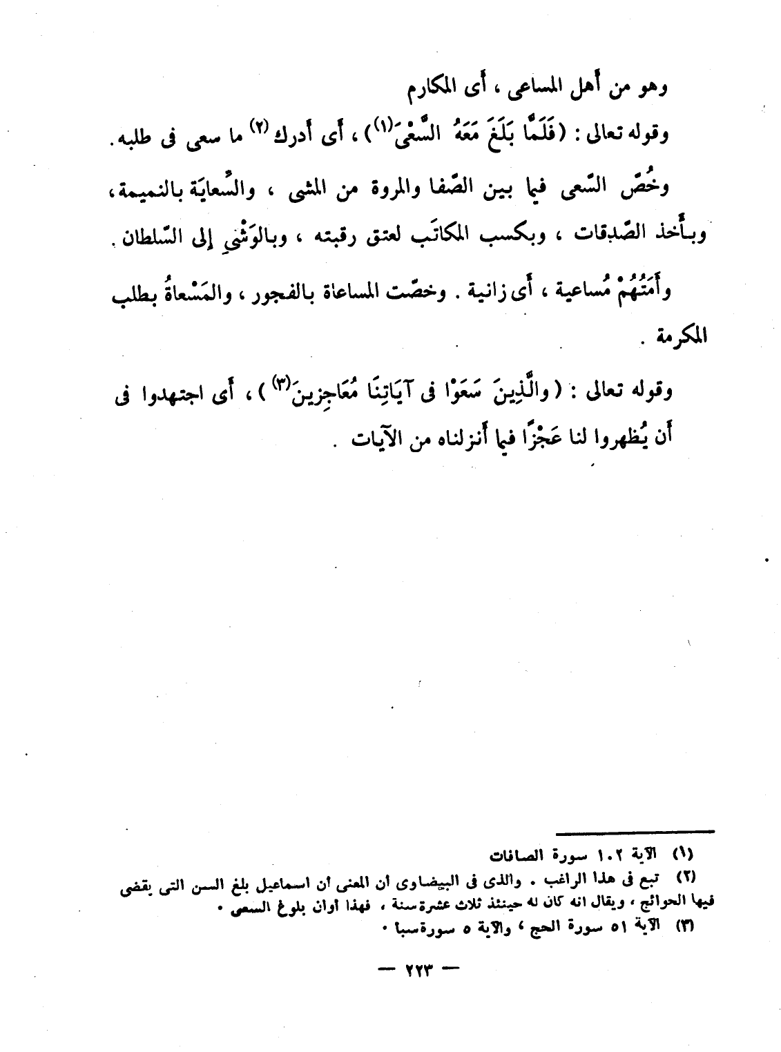 وقوله تعالى: {فَلَمَّا بَلَغَ مَعَهُ السعي} ، أَى أَدرك ما سعى فى طلبه. وخُصّ السّعى فيما بين الصّفا والمروة من المشى، والسِّعايَة بالنميمة، وبأَخذ الصّدقات، وبكسب المكاتَب لعتق رقبته، وبالوَشْىِ إِلى السّلطان.