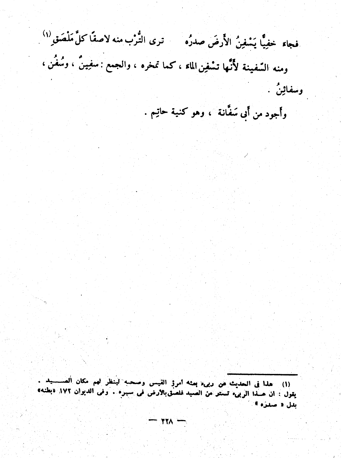 فجاءَ خِفيًّا يَسْفِنُ الأَرضَ صدرُه ... ترى التُّرْب منه لاصقًا كلَّ مَلْصَقِ