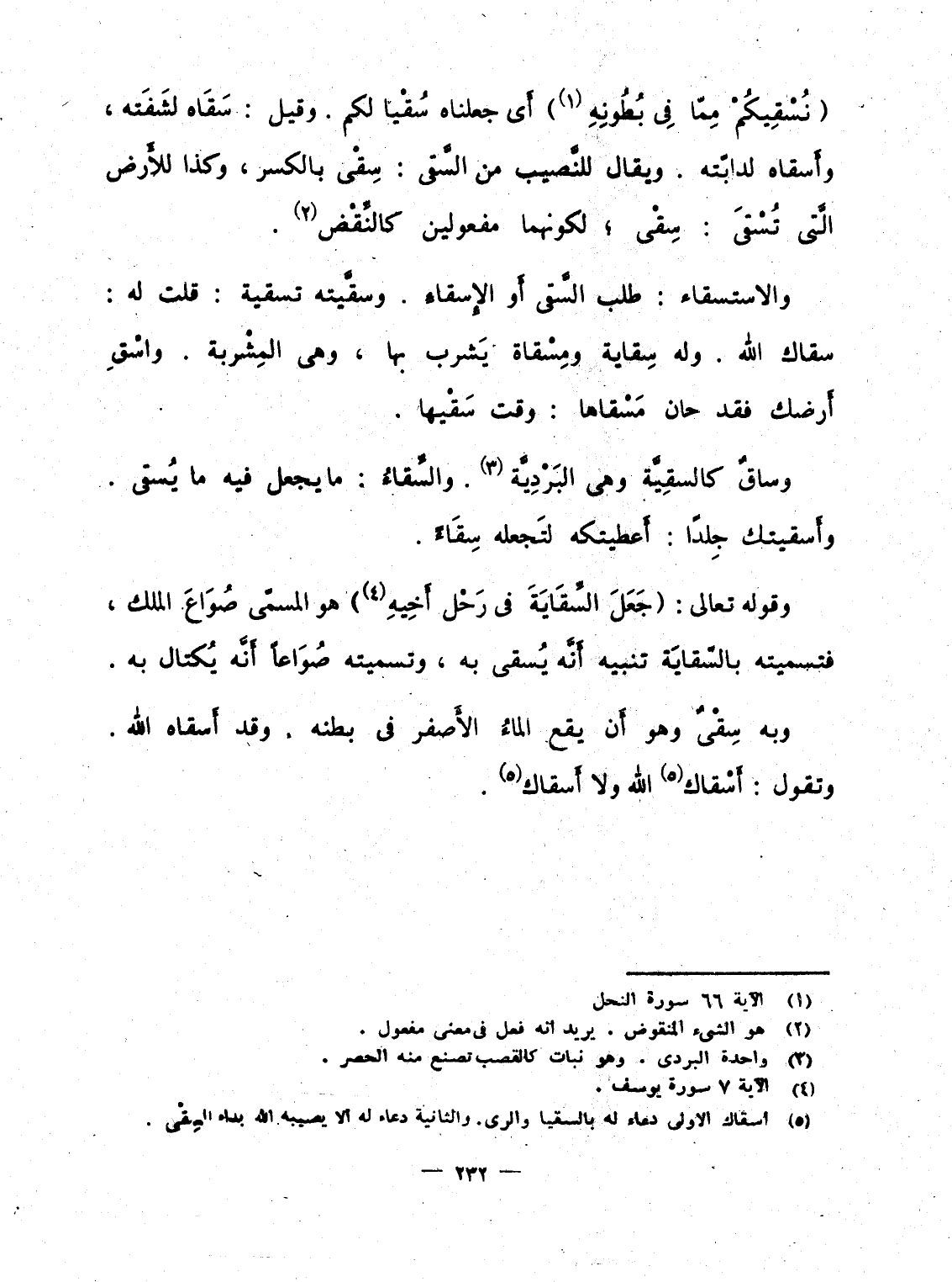 {نُّسْقِيكُمْ مِّمَّا فِي بُطُونِهِ} أَى جعلناه سُقْيا لكم. وقيل: سَقَاه لشَفَته، وأَسقاه لدابّته. ويقال للنَّصيب من السَّقى: سِقْى بالكسر، وكذا للأَرض الَّتى تُسْقَى: سِقْى؛ لكونهما مفعولين كالنِّقْض.