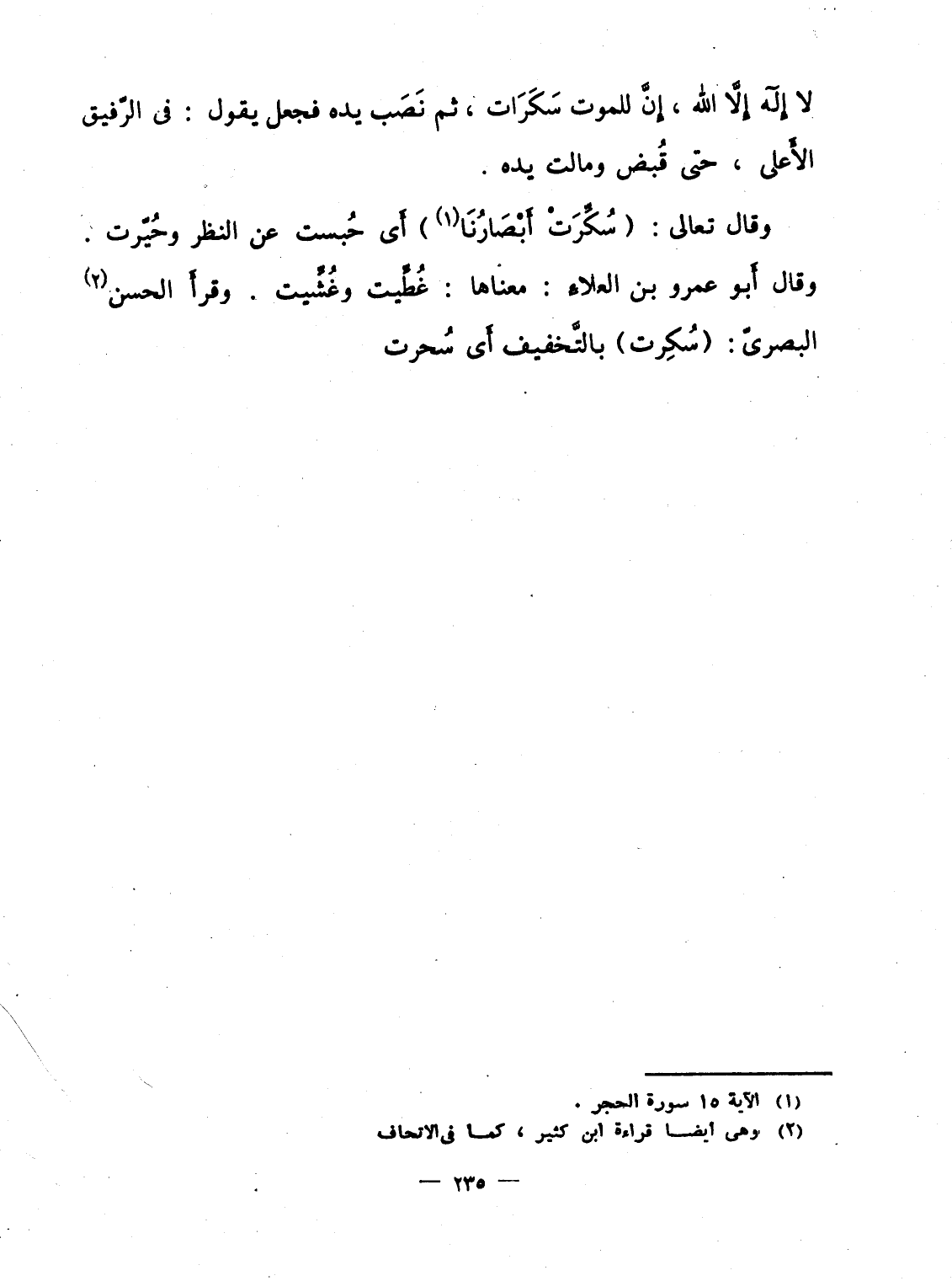 وقال تعالى: {سُكِّرَتْ أَبْصَارُنَا} أَى حُبست عن النظر وحُيّرت. وقال أَبو عمرو بن العلاءِ: معناها: غُطِّيت وغُشِّيت. وقرأَ الحسن البصرىّ: (سُكِرت) بالتَّخفيف أَى سُحرت.