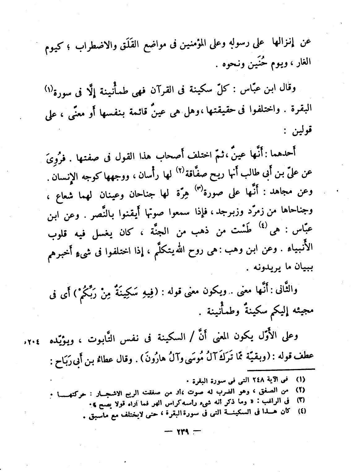 وقال ابن عبّاس: كلّ سكينة فى القرآن فهى طمأنينة إِلاَّ فى سورة البقرة. واختلفوا فى حقيقتها، وهل هى عينٌ قائمة بنفسها أَو معنًى، على قولين: