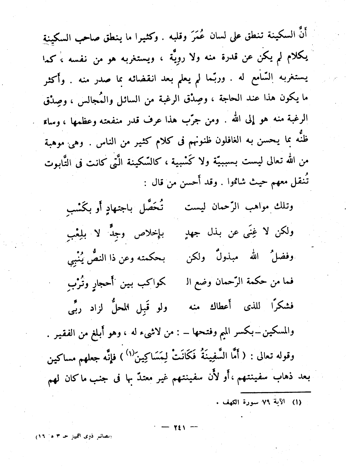 أَنَّ السكينة تنطق على لسان عُمَرَ وقلبه. وكثيرا ما ينطق صاحب السكينة بكلام لم يكن عن قدرة منه ولا رويَّة، ويستغربه هو من نفسه، كما يستغربه السّامع له. وربّما لم يعلم بعد انقضائه بما صدر منه. وأَكثر ما يكون هذا عند الحاجة، وصِدْق الرغبة من السائل والمُجالس، وصِدْق الرغبة منه هو إِلى الله. ومن جرّب هذا عرف قدر منفعته وعظمها، وساءَ ظنُّه بما يحسن به الغافلون ظنونهم فى كلام كثير من الناس. وهى موهبة من الله تعالى ليست بسببيّة ولا كَسْبية، كالسّكينة الَّتى كانت فى التَّابوت تُنقل معهم حيث شاءُوا. وقد أَحسن من قال: