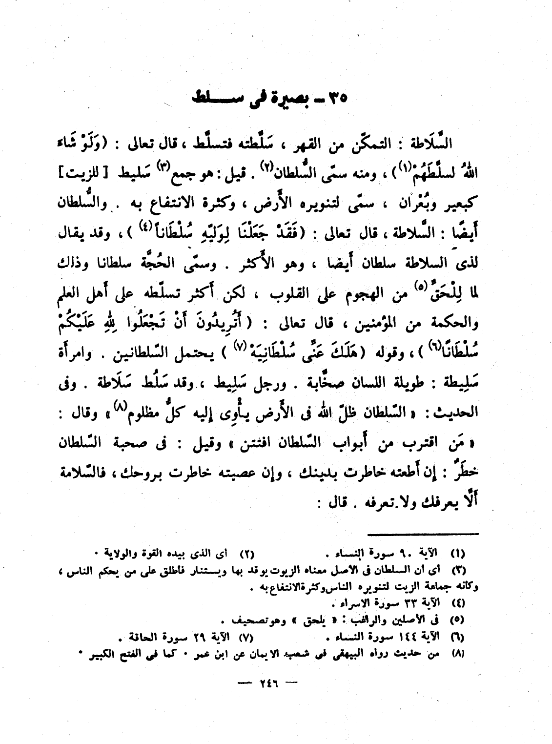 السَّلاَطة: التمكّن من القهر، سَلَّطته فتسلَّط، قال تعالى: {وَلَوْ شَآءَ الله لَسَلَّطَهُمْ} ، ومنه سمّى السُّلطان. قيل: هو جمع سَليط [للزيت] كبعير وبُعْران، سمّى لتنويره الأَرض، وكثرة الانتفاع به. والسُّلطان أَيضًا: السَّلاطة، قال تعالى: {فَقَدْ جَعَلْنَا لِوَلِيِّهِ سُلْطَاناً} ، وقد يقال لذى السلاطة سلطان أَيضاً، وهو الأَكثر. وسمّى الحُجَّة سلطانا وذلك لما لِلْحَقِّ من الهجوم على القلوب، لكن أَكثر تسلّطه على أَهل العلم والحكمة من المؤمنين، قال تعالى: {أَتُرِيدُونَ أَن تَجْعَلُواْ للَّهِ عَلَيْكُمْ سُلْطَاناً} ، وقوله: {هَّلَكَ عَنِّي سُلْطَانِيَهْ} يحتمل السّلطانين. وامرأَة سَلِيطة: طويلة اللسان صخَّابة. ورجل سَلِيط، وقد سَلُط سَلاَطة. وفى الحديث: "السّلطان ظلّ الله فى الأَرض يأْوِى إِليه كلُّ مظلوم" وقال: "مَن اقترب من أَبواب السّلطان افتتن" وقيل: فى صحبة السّلطان خطَرٌ: إِن أَطعته خاطرت بدينك؛ وإِن عصيته خاطرت بروحك، فالسّلامة أَلاَّ يعرفك ولا تعرفه. قال: