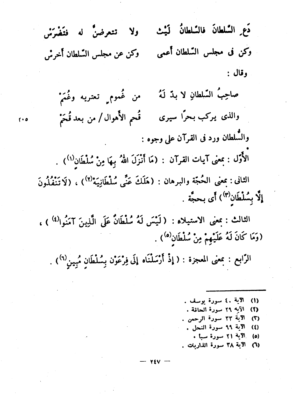الثانى: بمعنى الحُجّة والبرهان: {هَّلَكَ عَنِّي سُلْطَانِيَهْ} ، {لاَ تَنفُذُونَ إِلاَّ بِسُلْطَانٍ} أَى بحجَّة.