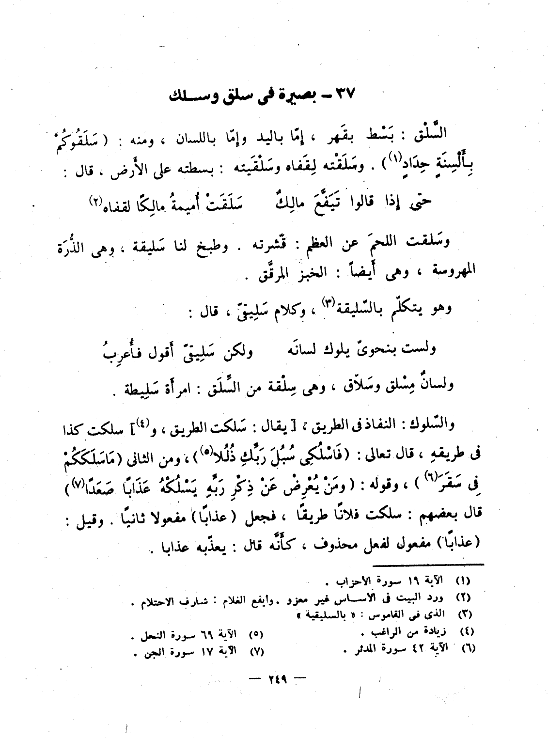 والسّلوك: النفاذ فى الطريق، [يقال: سَلكت الطريق، و] سلكت كذا فى طريقهِ، قال تعالى: {فاسلكي سُبُلَ رَبِّكِ ذُلُلاً} ، ومن الثانى {مَا سَلَكَكُمْ فِي سَقَرَ} ، وقوله: {وَمَن يُعْرِضْ عَن ذِكْرِ رَبِّهِ يَسْلُكْهُ عَذَاباً صَعَداً} قال بعضهم: سلكت فلانًا طريقًا، فجعل (عذابًا) مفعولا ثانيًا. وقيل: (عذابًا) مفعول لفعل محذوف، كأَنَّه قال: يعذّبه عذابا.