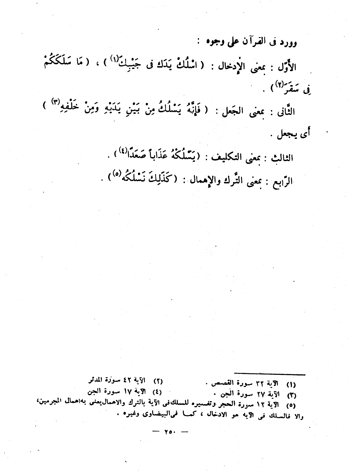 الأَوّل: بمعنى الإِدخال: {اسلك يَدَكَ فِي جَيْبِكَ} ، {مَا سَلَكَكُمْ فِي سَقَرَ} .