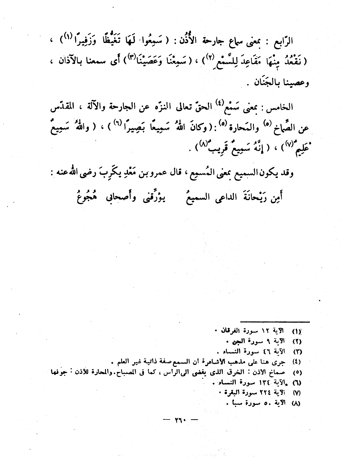 الخامس: بمعنى سَمْع الحقّ تعالى المنزّه عن الجارحة والآلة، المقدّس عن الصِّماخ والمَحارة: {وَكَانَ الله سَمِيعاً بَصِيراً} ، {والله سَمِيعٌ عَلِيمٌ} ، {إِنَّهُ سَمِيعٌ قَرِيبٌ} .