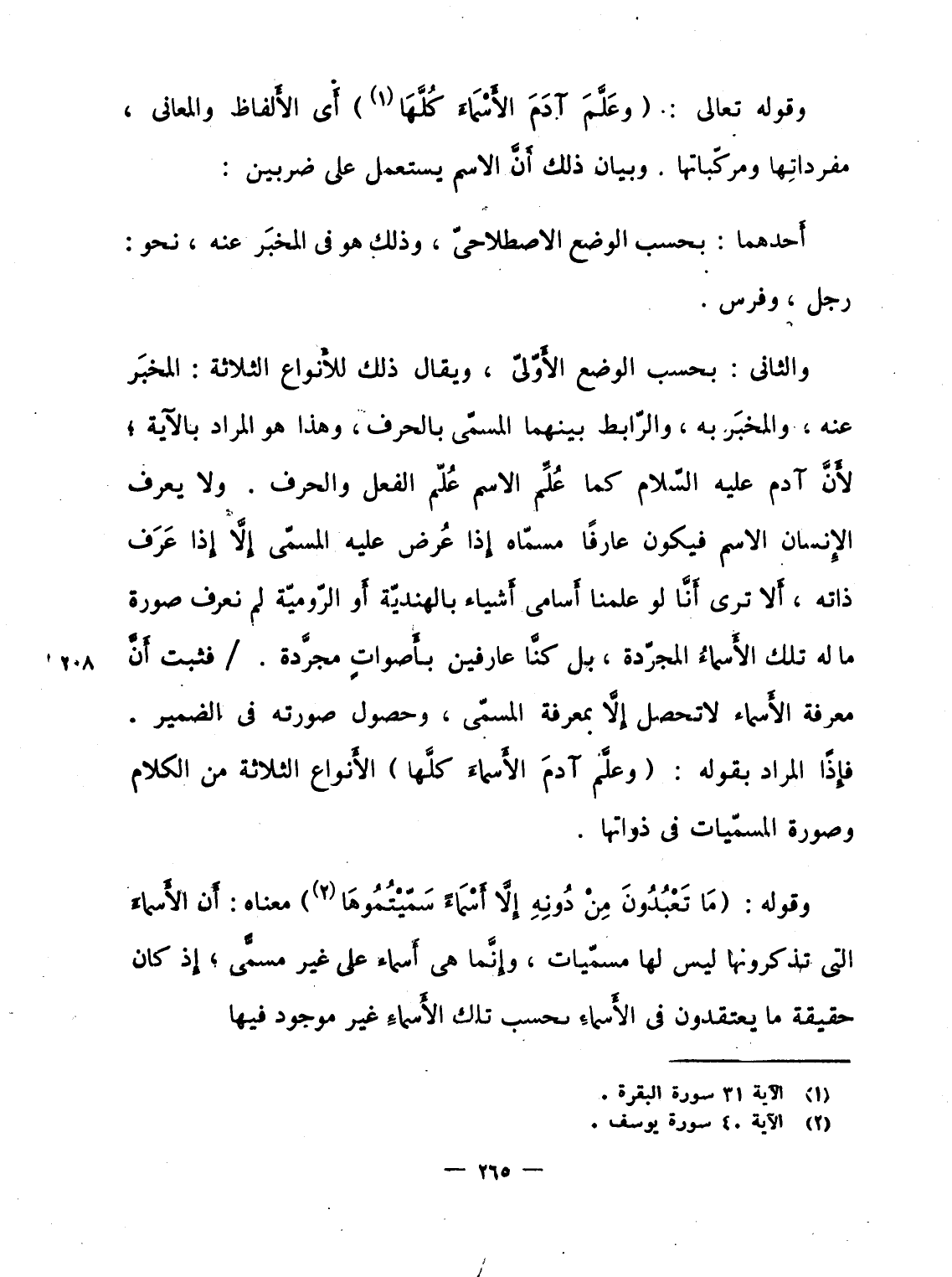 والثانى: بحسب الوضع الأَوّلىّ، ويقال ذلك للأَنواع الثلاثة: المخبَر عنه، والمخبَر به، والرّابط بينهما المسمّى بالحرف، وهذا هو المراد بالآية؛ لأَنَّ آدم عليه السّلام كما عُلِّم الاسم عُلّم الفعل والحرف. ولا يعرف الإِنسان الاسم فيكون عارفًا مسمّاه إِذا عُرض عليه المسمّى إِلاَّ إِذا عَرَف ذاته، أَلا ترى أَنَّا لو علمنا أَسامى أَشياء بالهنديّة أَو الرّوميّة لم نعرف صورة ما له تلك الأَسماءُ المجرّدة، بل كنَّا عارفين بأَصواتٍ مجرَّدة. / فثبت أَنَّ معرفة الأَسماء لا تحصل إِلاَّ بمعرفة المسمّى، وحصول صورته فى الضمير. فإِذًا المراد بقوله: {وَعَلَّمَءَادَمَ الأسمآء كُلَّهَا} الأَنواع الثلاثة من الكلام وصورة المسّميات فى ذواتها.