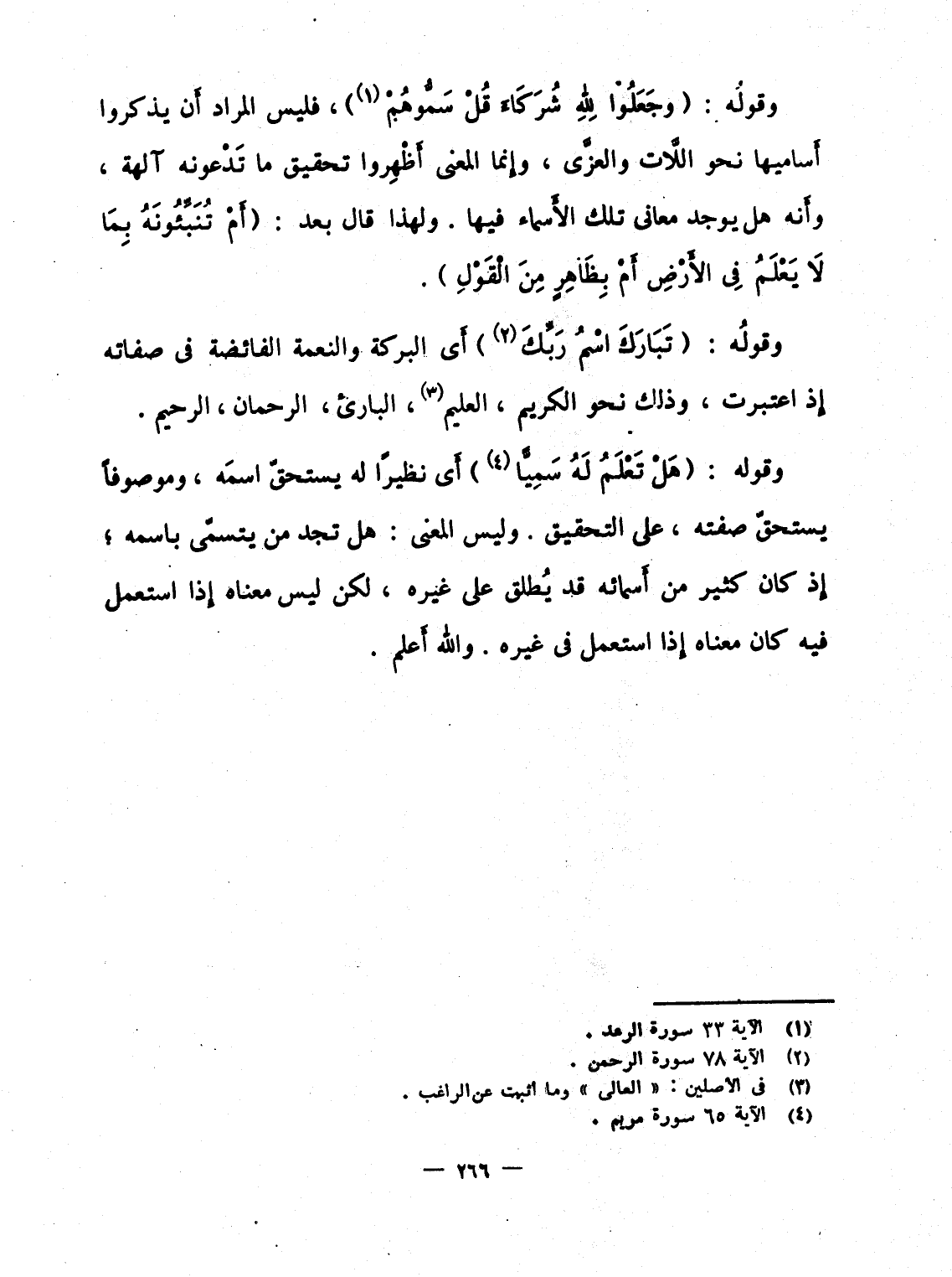 وقولُه: {وَجَعَلُواْ للَّهِ شُرَكَآءَ قُلْ سَمُّوهُمْ} ، فليس المراد أَن يذكروا أَساميها نحو الَّلات والعزَّى، وإِنما أَظْهِروا تحقيق ما تدْعونه آلهة، وأَنه هل يوجد معانى تلك الأَسماء فيها. ولهذا قال بعد: {أَمْ تُنَبِّئُونَهُ بِمَا لاَ يَعْلَمُ فِي الأرض أَم بِظَاهِرٍ مِّنَ القول} .
