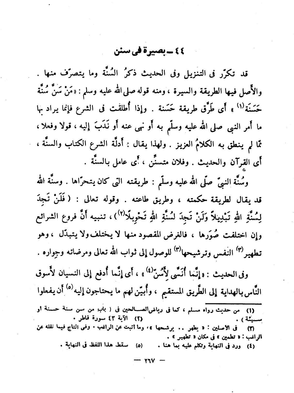 وسُنَّة النبىّ صلّى الله عليه وسلّم: طريقته التى كان يتحرّاها. وسنَّة الله قد يقال لطريقة حكمته، وطريق طاعته. وقوله تعالى: {فَلَن تَجِدَ لِسُنَّتِ الله تَبْدِيلاً وَلَن تَجِدَ لِسُنَّتِ الله تَحْوِيلاً} ، تنبيه أَنَّ فروع الشرائع وإِن اختلفت صُوَرها، فالغرض المقصود منها لا يختلف ولا يتبدّل، وهو تطهير النفس وترشيحها للوصول إِلى ثواب الله تعالى ومرضاته وجِواره.