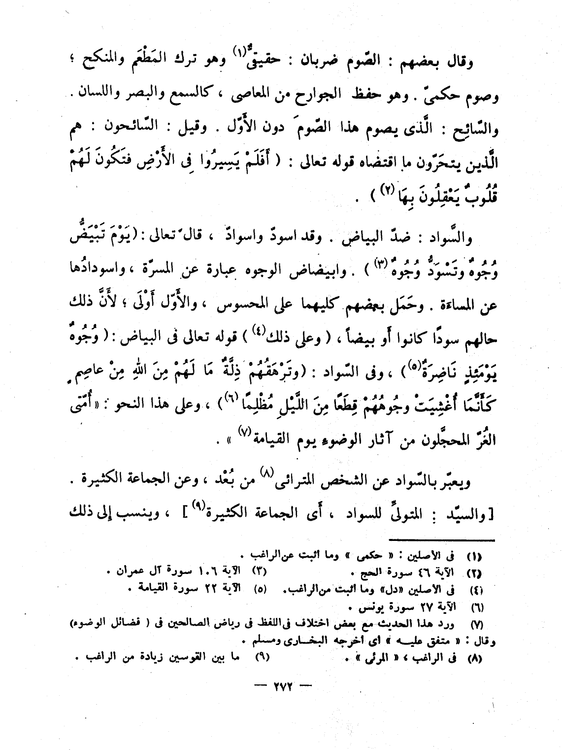 والسَّواد: ضدّ البياض. وقد اسودّ واسوادّ، قال تعالى: {يَوْمَ تَبْيَضُّ وُجُوهٌ وَتَسْوَدُّ وُجُوهٌ} . وابيضاض الوجوه عبارة عن المسرّة، واسودادُها عن المساءَة. وحَمَل بعضهم كليهما على المحسوس، والأَوّل أَوْلَى؛ لأَن ذلك حالهم سودًا كانوا أَو بيضاً، (وعلى ذلك) قوله تعالى فى البياض: {وُجُوهٌ يَوْمَئِذٍ نَّاضِرَةٌ} ، وفى السّواد: {وَتَرْهَقُهُمْ ذِلَّةٌ مَّا لَهُمْ مِّنَ الله مِنْ عَاصِمٍ كَأَنَّمَا أُغْشِيَتْ وُجُوهُهُمْ قِطَعاً مِّنَ الليل مُظْلِماً} ، وعلى هذا النحو: "أُمّتى الغُرّ المحجَّلون من آثار الوضوءِ يوم القيامة".