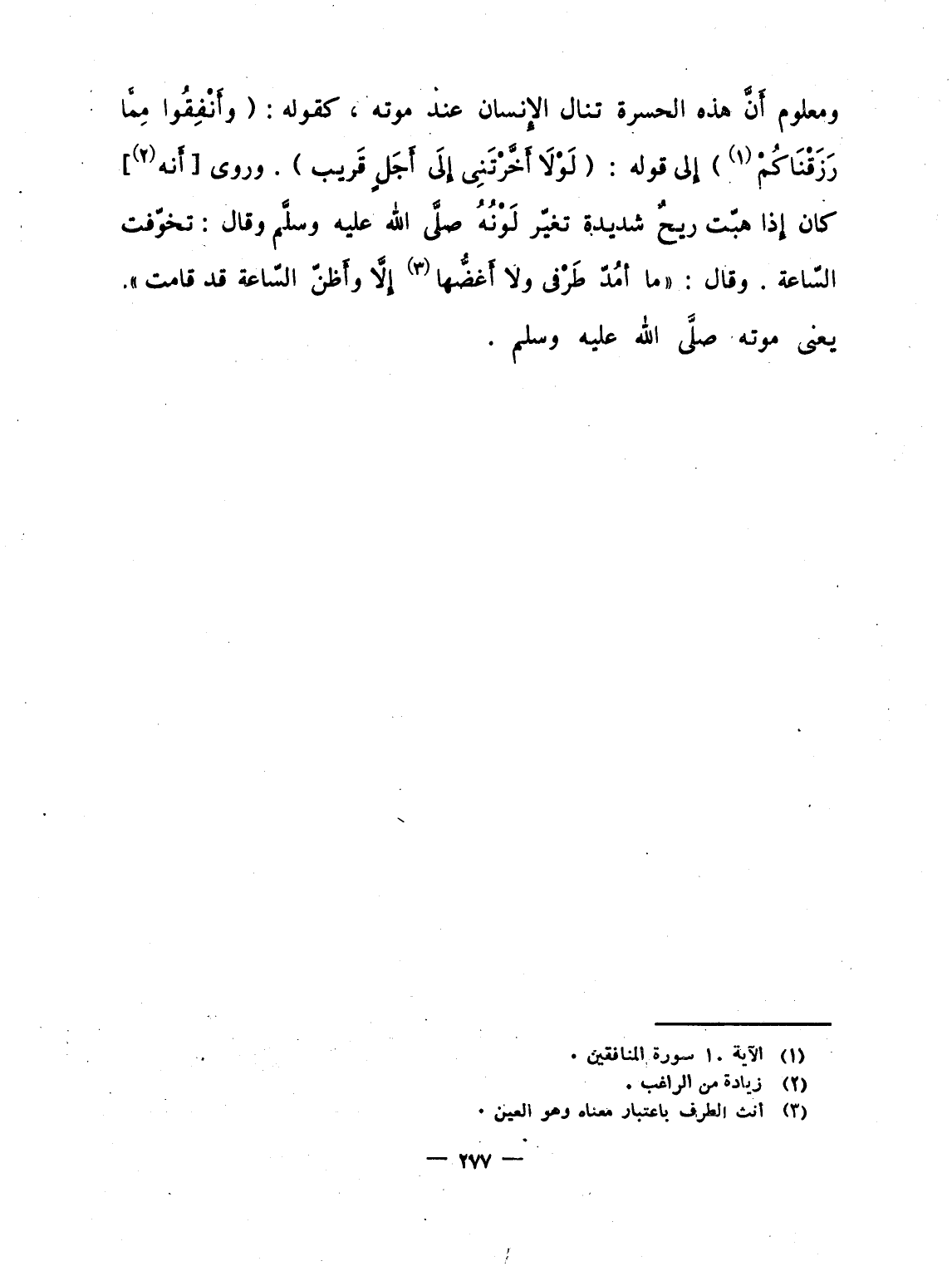ومعلوم أَنَّ هذه الحسرة تنال الإِنسان عند موته، كقوله: {وَأَنفِقُواْ مِن مَّا رَزَقْنَاكُمْ} إِلى قوله: {لولا أخرتني إلى أَجَلٍ قَرِيبٍ} . وروى: [أَنه] كان إِذا هبّت ريحٌ شديدة تغيّر لَوْنُهُ صلَّى الله عليه وسلَّم وقال تخوّفت السّاعة. وقال: "ما أمُدّ طَرْفى ولا أغضُّها إِلاَّ وأَظنّ السّاعة قد قامت" يعنى موته صلَّى الله عليه وسلم.