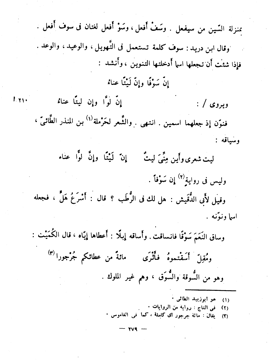 وقال ابن دريد: سوف كلمة تستعمل فى التَّهويل، والوعيد، والوعد. فإِذا شئت أَن تجعلها اسما أَدخلتها التنوين، وأَنشد: