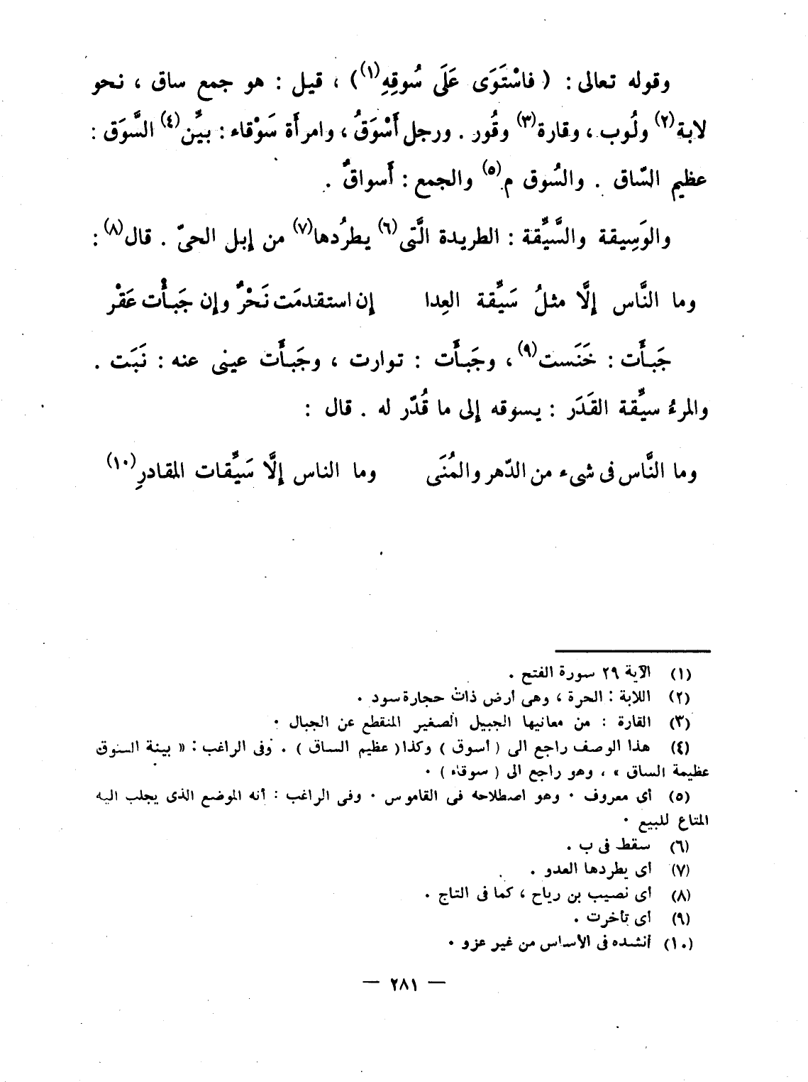 وقوله تعالى: {فاستوى على سُوقِهِ} ، قيل: هو جمع ساق، نحو لابة ولُوب، وقارة وقُور. ورجل أَسْوَقُ، وامرأَة سَوْقاء: بيِّن السَّوَق: عظيم السّاق. والسُوق م والجمع: أَسواقٌ.