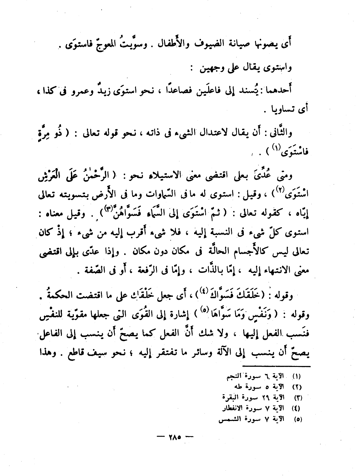 ومتى عُدِّى بعلى اقتضى معنى الاستيلاءِ نحو: {الرحمان عَلَى العرش استوى} ، وقيل: استوى له ما فى السّماوات وما فى الأَرض بتسويته تعالى إِيّاه، كقوله تعالى: {ثُمَّ استوى إِلَى السمآء فَسَوَّاهُنَّ} . وقيل معناه: استوى كلّ شىء فى النسبة إِليه، فلا شىء أَقرب إِليه من شىء؛ إِذْ كان تعالى ليس كالأَجسام الحالَّة فى مكان دون مكان. وإِذا عدّى بإِلى اقتضى معنى الانتهاء إِليه، إِمّا بالذَّات، وإِمّا فى الرّفعة، أَو فى الصّفة.