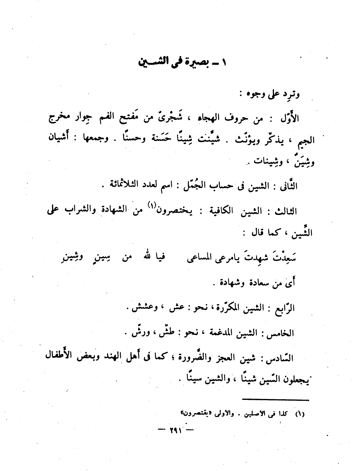 السّادس: شين العجز والضَّرورة؛ كما فى أَهل الهند وبعض الأَطفال يجعلون السّين شينًا، والشين سينًا.