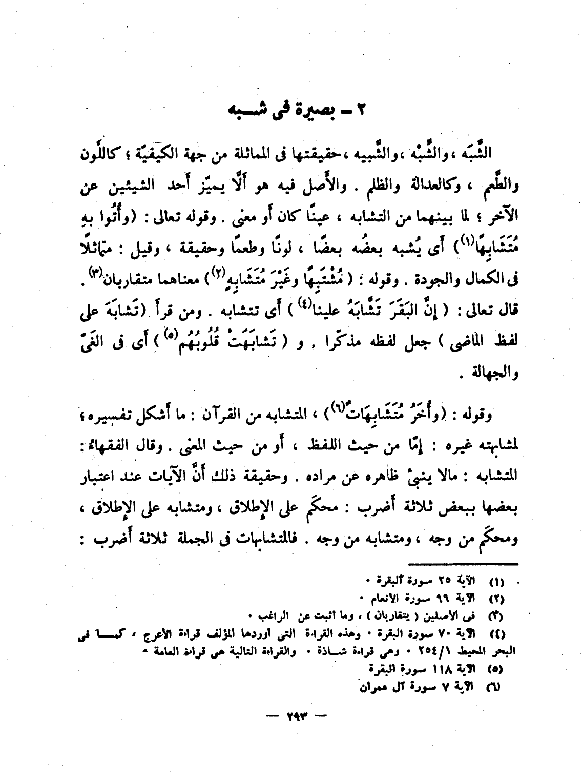 الشَّبَه، والشِّبْه، والشَّبيه، حقيقتها فى المماثلة من جهة الكيفيّة؛ كاللون والطَّعم، وكالعادلة والظلم. والأَصل فيه هو أَلاَّ يميّز أَحد الشيئين عن الآخر؛ لما بينهما من التشابه، عينًا كان أَو معنى. وقوله تعالى: {وَأُتُواْ بِهِ مُتَشَابِهاً} أَى يُشبه بعضُه بعضًا، لونًا وطعمًا وحقيقة، وقيل: متماثلاً فى الكمال والجودة. وقوله: {مُشْتَبِهاً وَغَيْرَ مُتَشَابِهٍ} معناهما متقاربان. قال تعالى: {إِنَّ البقر تَشَابَهَ عَلَيْنَا} أَى تتشابه. ومن قرأَ (تَشابَهَ على لفظ الماضى) جعل لفظه مذكّرا، و {تَشَابَهَتْ قُلُوبُهُمْ} أَى فى الغَىّ والجهالة.