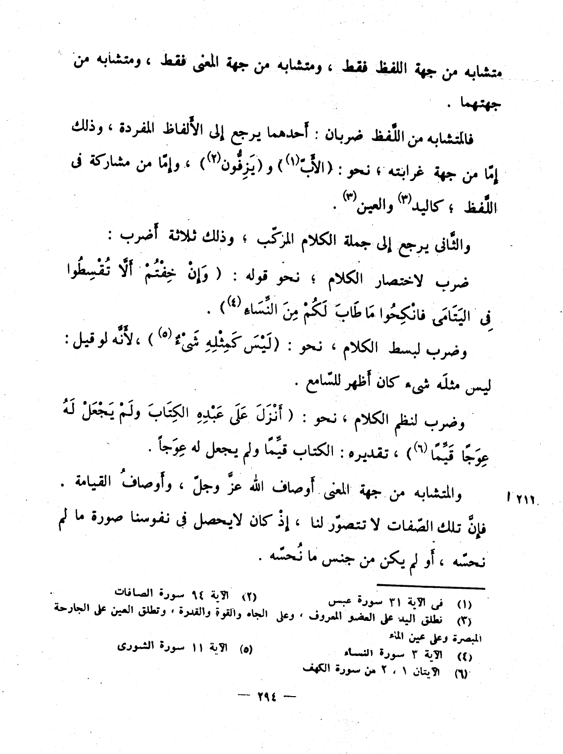 فالمتشابه من اللَّفظ ضربان: أَحدهما يرجع إِلى الأَلفاظ المفردة، وذلك إِمّا من جهة غرابته؛ نحو: {وَأَبّاً} و {يَزِفُّونَ} ، وإِمّا من مشاركة فى اللَّفظ؛ كاليد والعين.