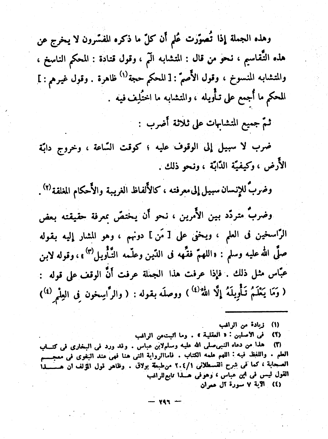 وضربٌ متردّد بين الأَمرين، نحو أَن يختصّ بمعرفة حقيقته بعض الرّاسخين فى العلم، ويخفى على [مَن] دونهم، وهو المشار إِليه بقوله صلَّى الله عليه وسلم: "اللهمّ فقِّهه فى الدّين وعلّمه التَّأْويل"، وقوله لابن عبّاس مثل ذلك. فإِذا عرفت هذا الجملة عرفت أَنَّ الوقف على قوله: {وَمَا يَعْلَمُ تَأْوِيلَهُ إِلاَّ الله} ووصلَه بقوله: {والراسخون فِي العلم}