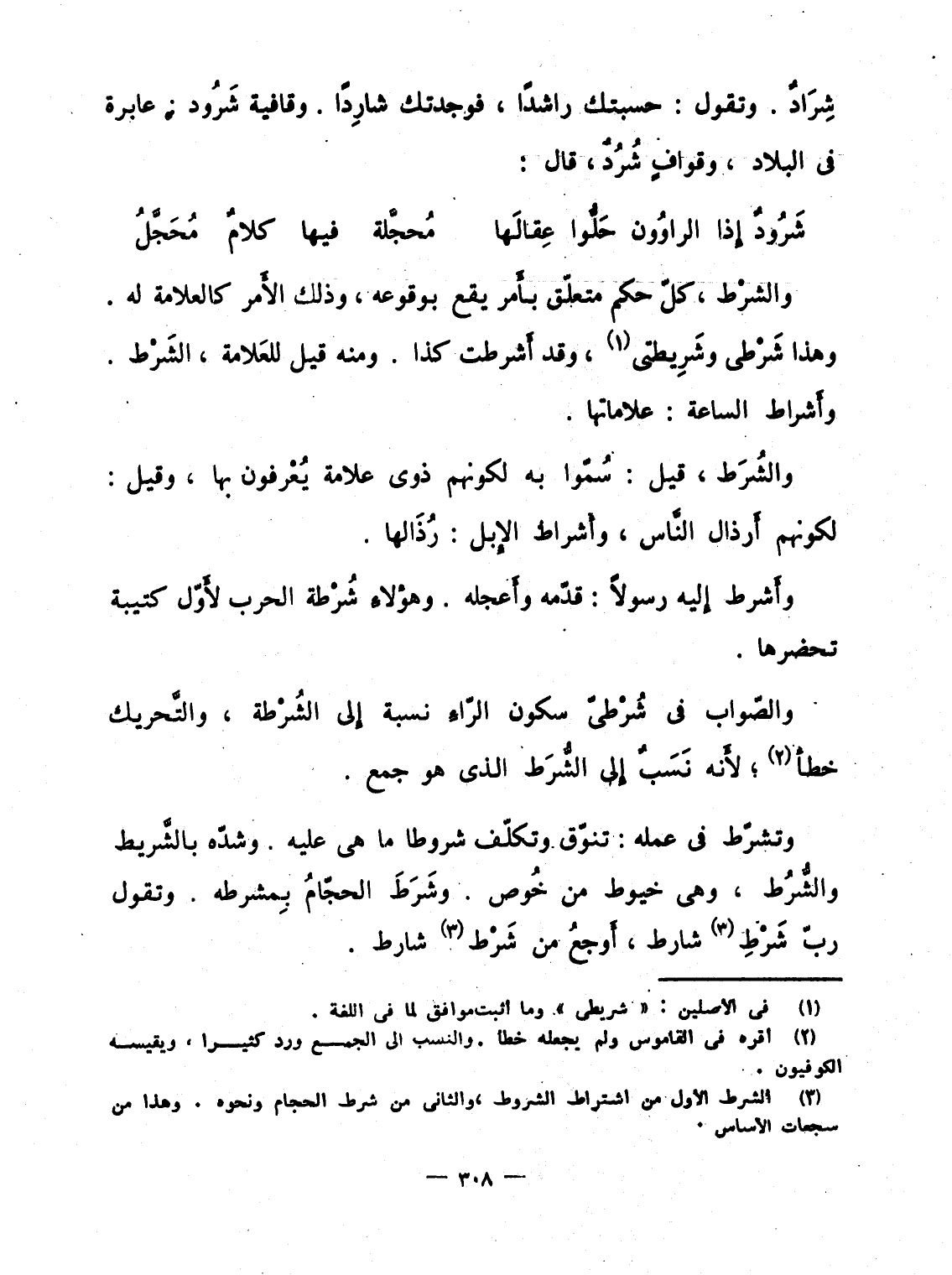 والشُرَط، قيل: سُمّوا به لكونهم ذوى علامة يُعْرفون بها، وقيل: لكونهم أَرذال النَّاس، وأَشراط الإِبل: رُذَالها.