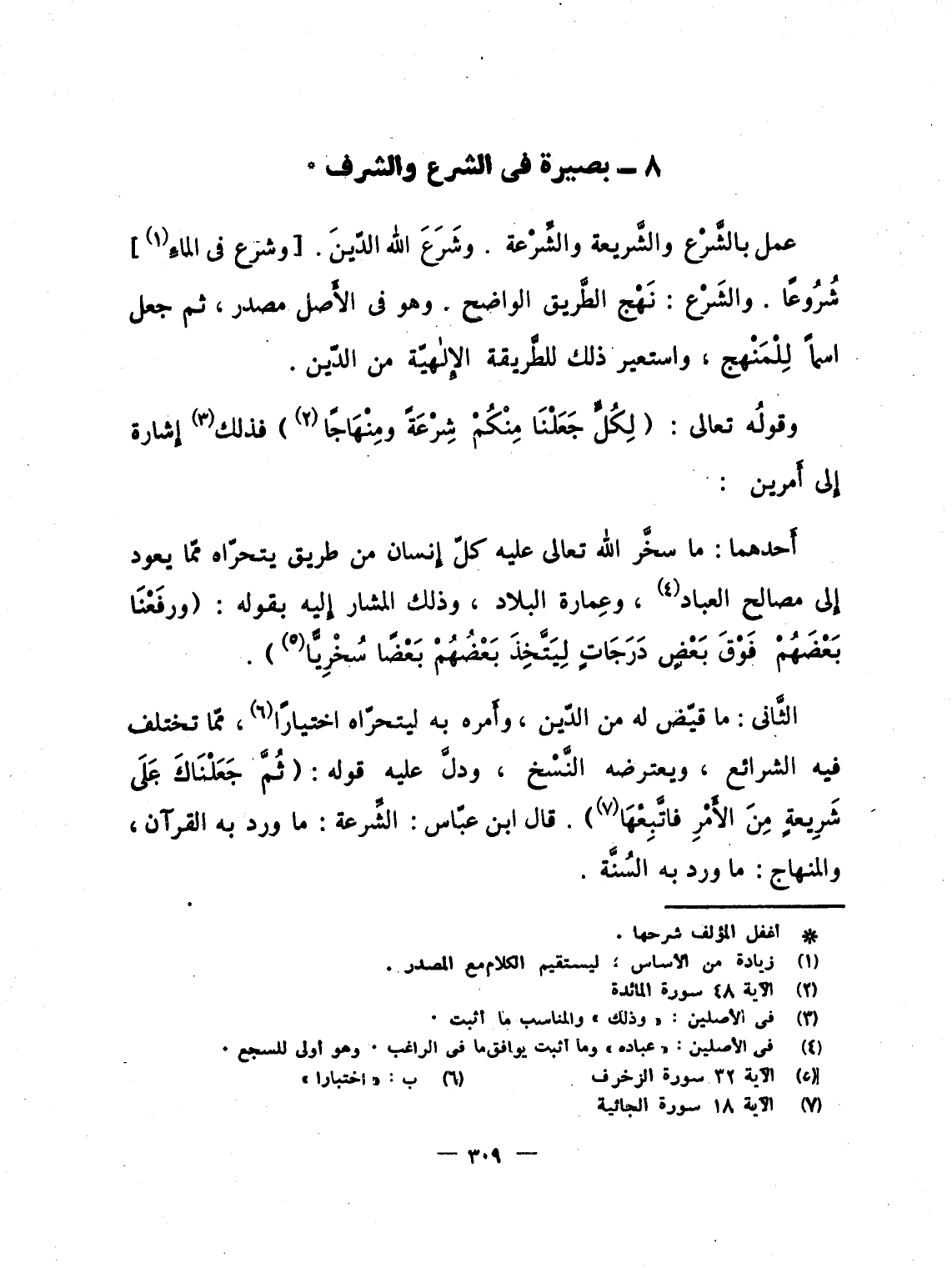 الثَّانى: ما قيّض له من الدّين، وأَمره به ليتحرّاه اختيارًا، ممّا تختلف فيه الشرائع، ويعترضه النَّسْخ، ودلَّ عليه قوله: {ثُمَّ جَعَلْنَاكَ على شَرِيعَةٍ مِّنَ الأمر فاتبعها} . قال ابن عبّاس: الشِّرعة: ما ورد به القرآن، والمنهاج: ما ورد به السُنَّة.