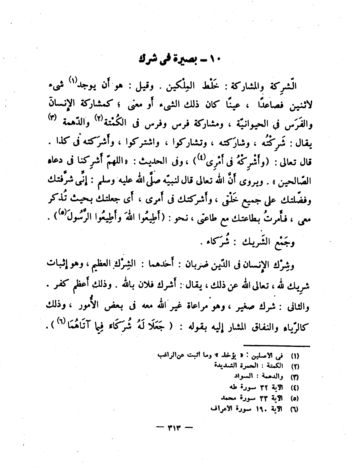 قال تعالى: {وَأَشْرِكْهُ في أَمْرِي} ، وفى الحديث: "اللهمّ أَشرِكنا فى دعاءِ الصّالحين". ويروى أَنَّ الله تعالى قال لنبيّه صلَّى الله عليه وسلم: إِنِّى شرَّفتك وفضّلتك على جميع خَلْقى، وأَشركتك فى أَمرى، أَى جعلتك بحيث تُذكر معى، فأَمرتُ بطاعتك مع طاعتى، نحو: {أَطِيعُواْ اللَّهَ وَأَطِيعُواْ الرسول} .