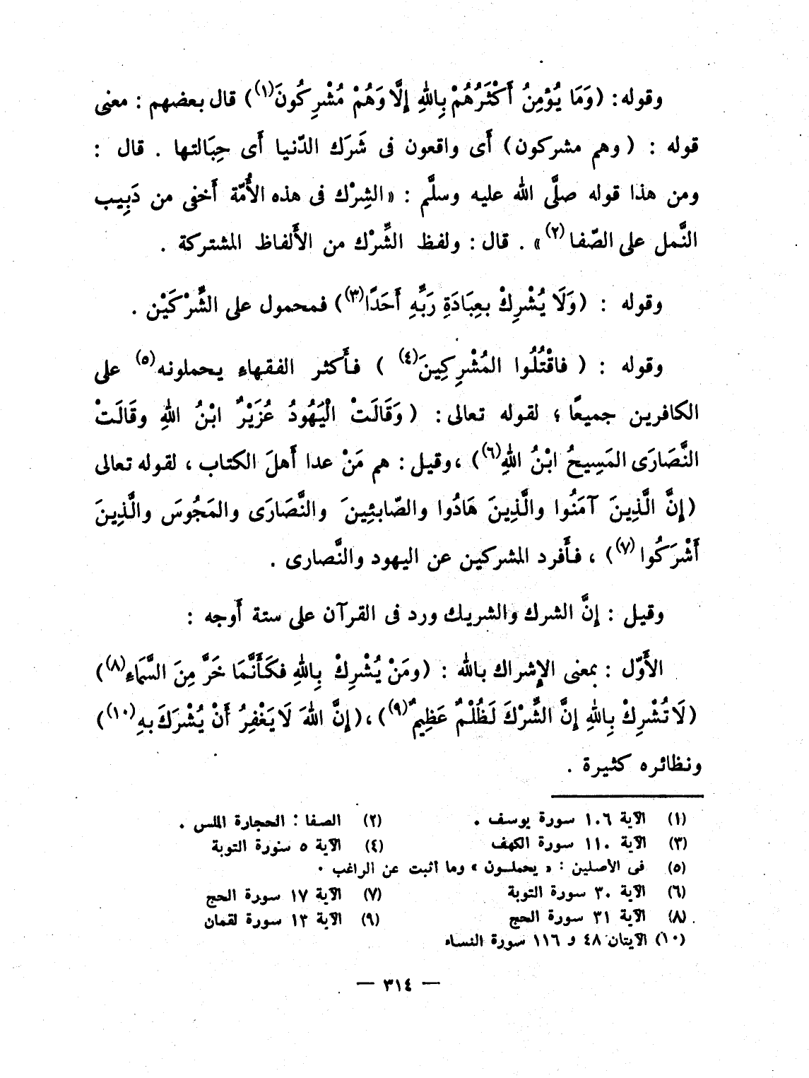 وقوله: {وَمَا يُؤْمِنُ أَكْثَرُهُمْ بالله إِلاَّ وَهُمْ مُّشْرِكُونَ} قال بعضهم: معنى قوله: {وَهُمْ مُّشْرِكُونَ} أَى واقعون فى شَرَك الدّنيا أَى حِبَالتها. قال: ومن هذا قوله صلّى الله عليه وسلَّم: "الشِرْك فى هذه الأُمّة أَخفى من دَبِيب النَّمل على الصّفا". قال: ولفظ الشِّرْك من الأَلفاظ المشتركة.