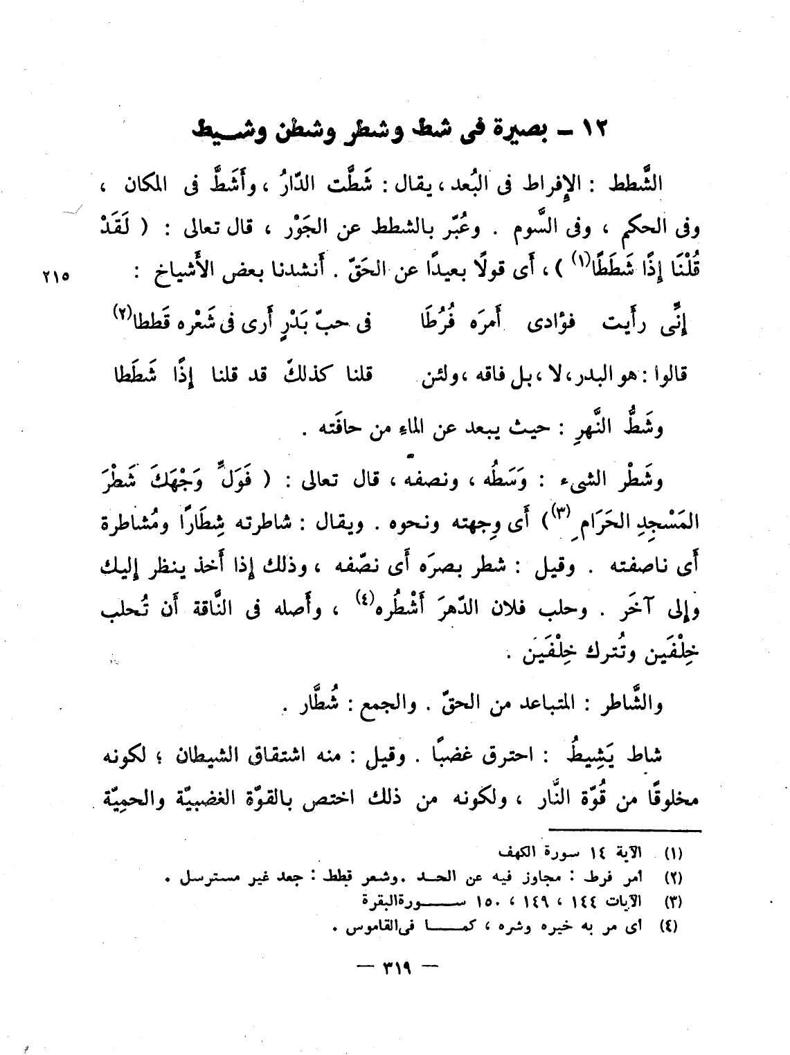 الشِّطط: الإِفراط فى البُعد، يقال: شَطَّت الدّارُ، وأَشَطَّ فى المكان، وفى الحكم، وفى السَّوم. وعُبّر بالشطط عن الجَوْر، قال تعالى: {لَّقَدْ قُلْنَا إِذاً شَطَطاً} ، أَى قولاً بعيدًا عن الحَقّ. أَنشدنا بعض الأَشياخ: