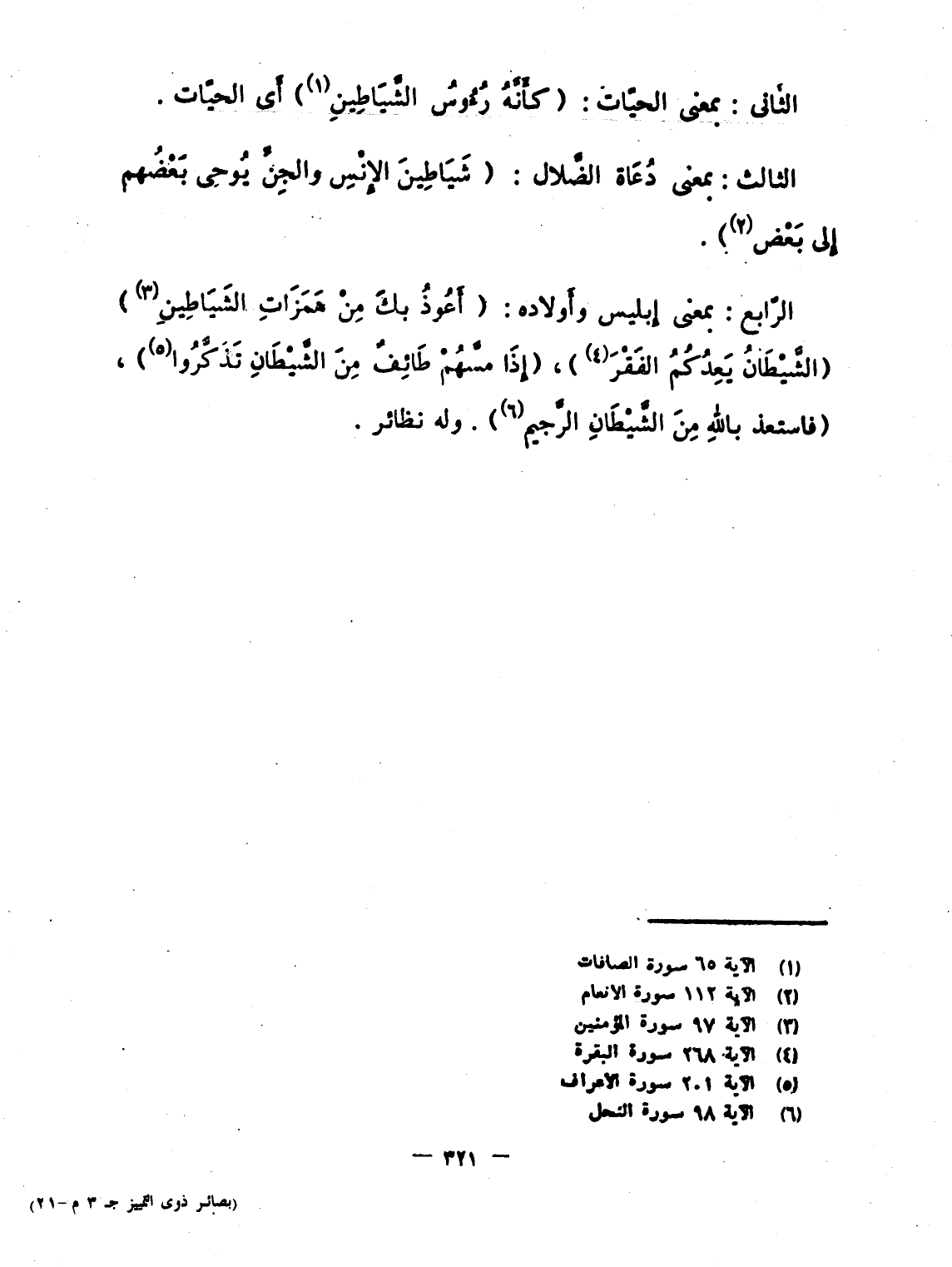 الرّابع: بمعنى إِبليس وأَولاده: {أَعُوذُ بِكَ مِنْ هَمَزَاتِ الشياطين} {الشيطان يَعِدُكُمُ الفقر} ، {إِذَا مَسَّهُمْ طَائِفٌ مِّنَ الشيطان تَذَكَّرُواْ} ، {فاستعذ بالله مِنَ الشيطان الرجيم} . وله نظائر.
