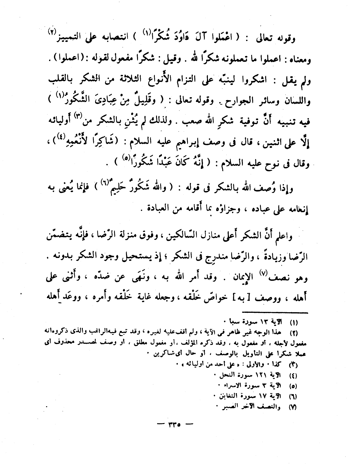 واعلم أَنَّ الشكر أَعلى منازل السّالكين، وفوق منزلة الرّضا، فإِنَّه يتضمّن الرّضا وزيادةً، والرّضا مندرِج فى الشكر؛ إِذ يستحيل وجود الشكر بدونه. وهو نصف الإِيمان. وقد أَمر الله به، ونَهَى عن ضدّه، وأَثنى على أَهله، ووصف [به] خواصّ خَلْقه، وجعله غاية خَلْقه وأَمره، ووعَد أَهله