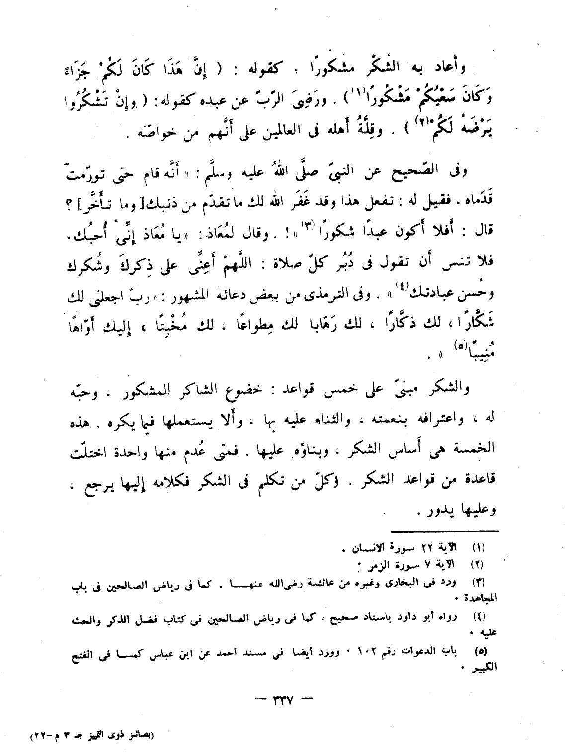 وفى الصّحيح عن النبىّ صلَّى اللهُ عليه وسلَّم: "أَنَّه قام حتى تورّمت قَدَماه، فقيل له: تفعل هذا وقد غَفَر الله لك ما تقدّم من ذنبك [وما تأَخَّر] ؟ قال: أَفلا أَكون عبدًا شكورًا"!. وقال لمُعَاذ "يا مُعَاذ إِنِّى أُحبُك، فلا تنس أَن تقول فى دُبُر كلّ صلاة: اللَّهمّ أَعنِّى على ذكركَ وشُكرك وحُسن عبادتك". وفى الترمذى من بعض دعائه المشهور: "ربّ اجعلنى لك شَكَّارًا، لك ذكَّارًا، لك رَهّابا لك مِطواعًا، لك مُخْبِتًا، إِليك أَوّاهًا مُنِيبًا".