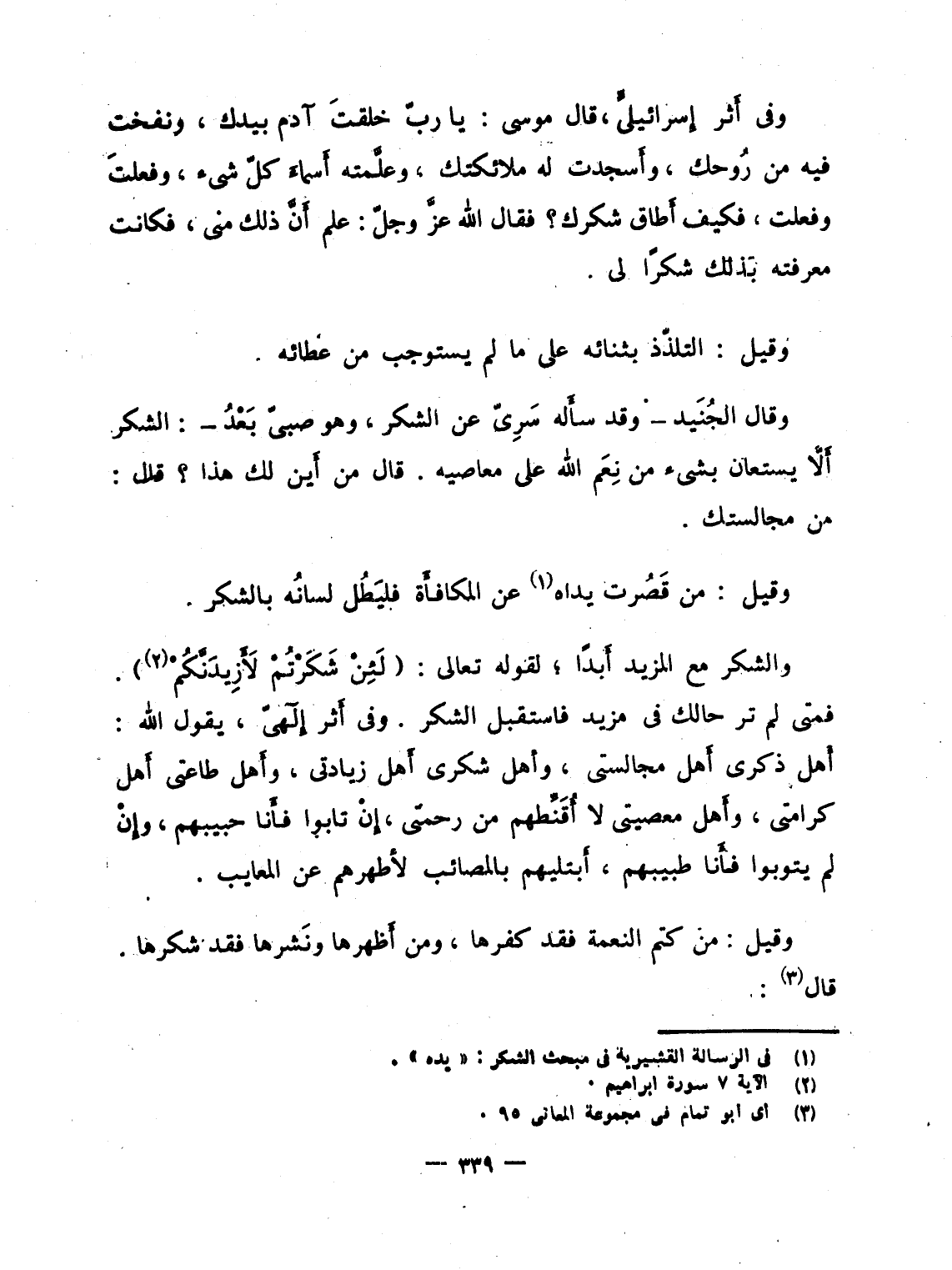 وفى أَثر إِسرائيلىِّ، قال موسى: يا ربّ خلقتَ آدم بيدك، ونفخت فيه من رُوحك، وأَسجدت له ملائكتك، وعلَّمته أَسماءَ كلّ شىء، وفعلتَ وفعلت، فكيف أَطاق شكرك. فقال الله عزَّ وجلّ: علم أَنَّ ذلك منى، فكانت معرفته بذلك شكرًا لى.