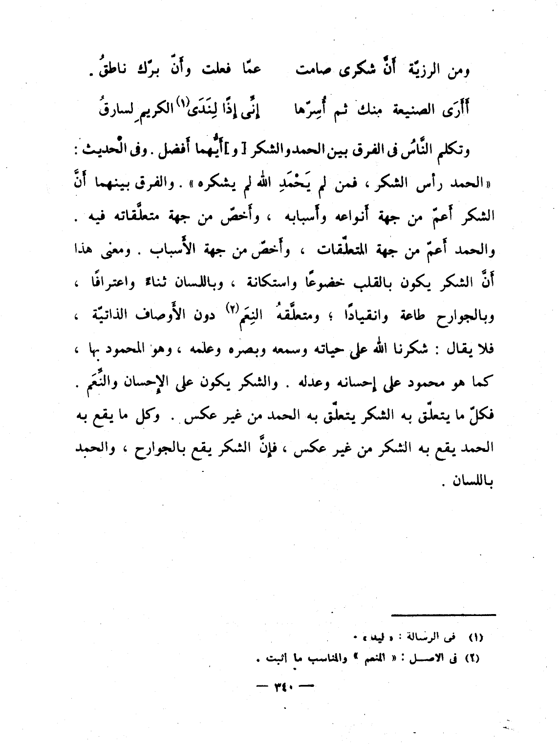 وتكلم النَّاسُ فى الفرق بين الحمد والشكر [و] أَيُّهما أَفضل. وفى الحديث: "الحمد رأس الشكر، فمن لم يَحْمَدِ الله لم يشكره". والفرق بينهما أَنَّ الشكر أَعمّ من جهة أَنواعه وأَسبابه، وأَخصّ من جهة متعلَّقاته فيه. والحمد أَعمّ من جهة المتعلّقات، وأَخصّ من جهة الأَسباب. ومعنى هذا أَنَّ الشكر يكون بالقلب خضوعًا واستكانة، وباللسان ثناءً واعترافًا، وبالجوارح طاعة وانقيادًا؛ ومتعلَّقهُ النِعَم دون الأَوصاف الذاتيّة، فلا يقال: شكرنا الله على حياته وسمعه وبصره وعلمه، وهو المحمود بها، كما هو محمود على إِحسانه وعدله. والشكر يكون على الإِحسان والنِّعَم. فكلّ ما يتعلّق به الشكر يتعلّق به الحمد من غير عكس. وكل ما يقع به الحمد يقع به الشكر من غير عكس، فإِنَّ الشكر يقع بالجوارح، والحمد باللسان.
