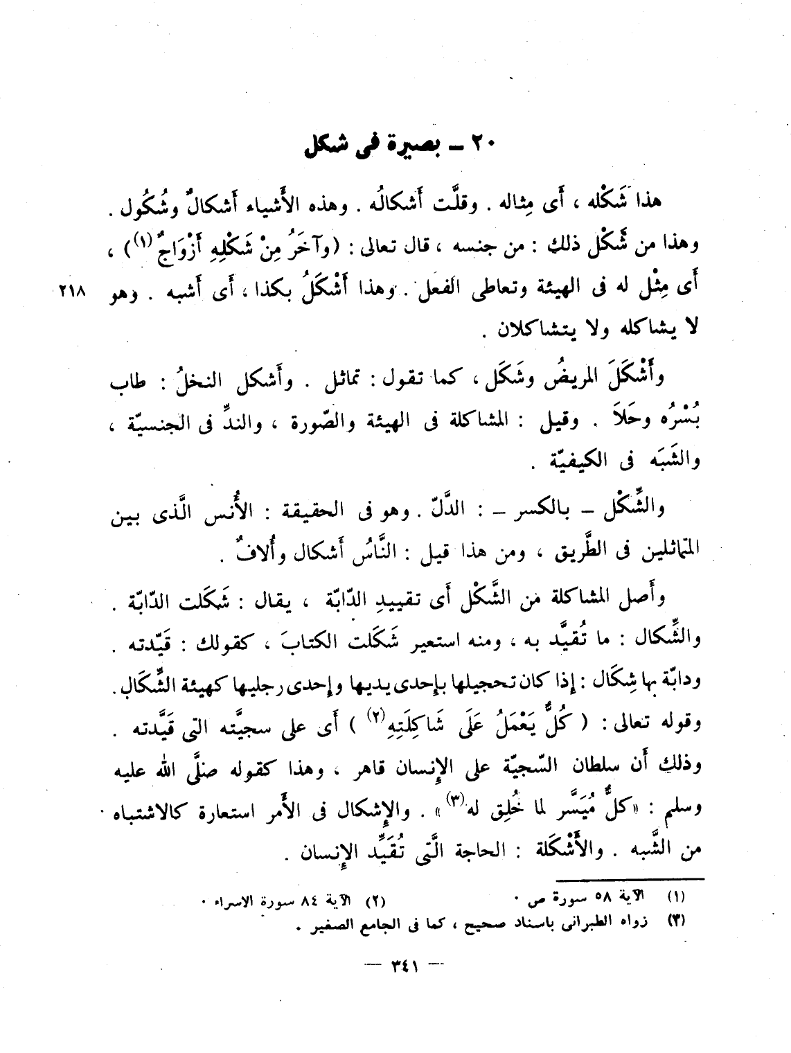 وأَصل المشاكلة من الشَّكْل أَى تقييدِ الدّابّة، يقال: شَكَلت الدّابّة. والشِّكال: ما تُقيَّد به، ومنه استعير شَكَلت الكتابَ، كقولك: قَيّدته. ودابّة بها شِكَال: إِذا كان تحجيلها بإِحدى يديها وإِحدى رجليها كهيئة الشِّكَال. وقوله تعالى: {كُلٌّ يَعْمَلُ على شَاكِلَتِهِ} أَى على سجيَّته التى قَيَّدته. وذلك أَن سلطان السّجيّة على الإِنسان قاهر، وهذا كقوله صلَّى الله عليه وسلم: "كلٌّ مُيَسَّر لما خُلِق له". والإِشكال فى الأَمر استعارة كالاشتباه من الشَّبه. والأَشْكَلة: الحاجة الَّتى تُقَيِّد الإِنسان.