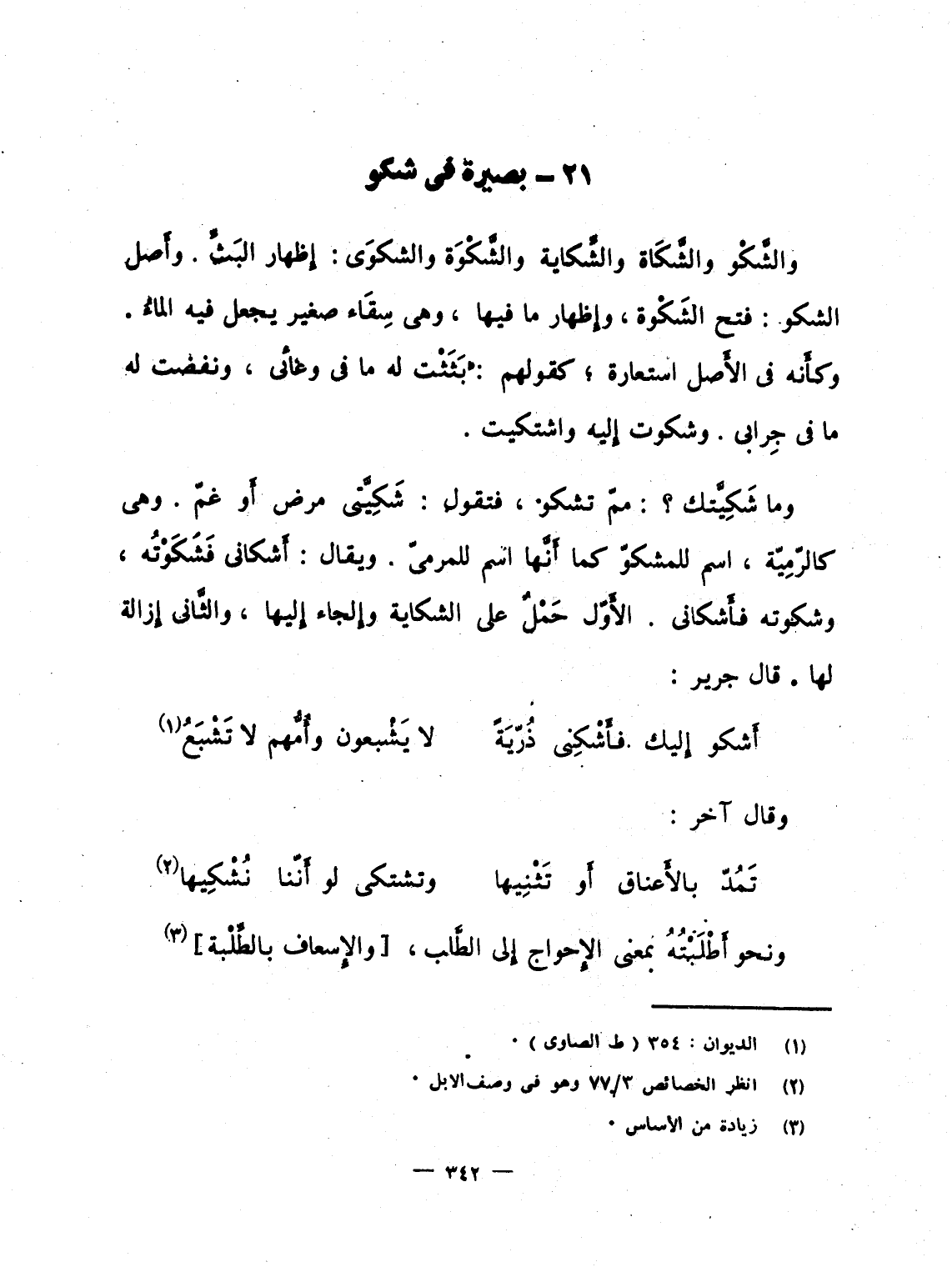 والشَّكْو والشَّكَاة والشِّكاية والشَّكْوَة والشكوَى: إِظهار البَثِّ. وأَصل الشكو: فتح الشَكْوة، وإِظهار ما فيها، وهى سِقَاء صغير يجعل فه الماءُ، وكأَنه فى الأَصل استعارة؛ كقولهم: بَثَثْت له ما فى وعائى، ونفضت له ما فى جِرابى. وشكوت إِليه واشتكيت.