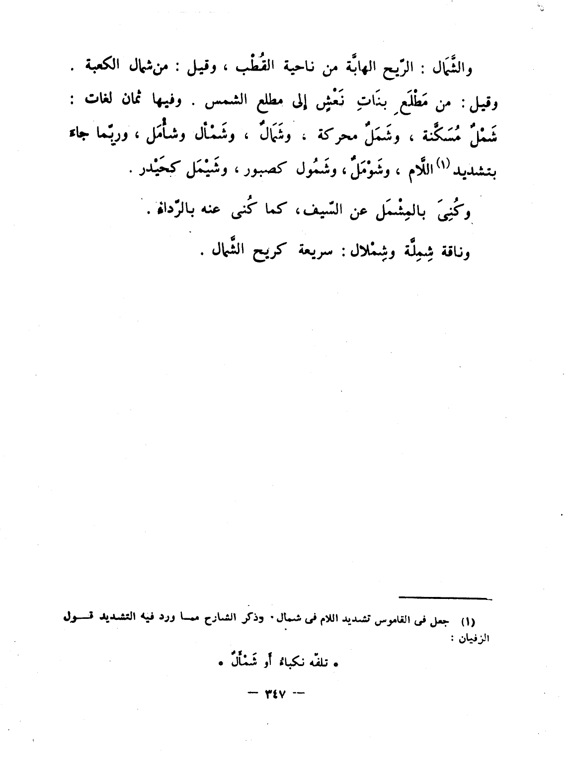 والشَّمَال: الرّيح الهابَّة من ناحية القُطْب، وقيل: من شمال الكعبة. وقيل: من مَطْلَعِ بنَاتِ نَعْشٍ إِلى مطلع الشمس. وفيها ثمان لغات: شَمْلٌ مُسَكَّنة، وشَمَلٌ محركة، وشَمَالٌ، وشَمْأل وشأْمَل، وربّما جاءَ بتشديد الَّلام، وشَوْمَلٌ، وشَمُول كصبور، وشَيْمَل كحَيْدر.