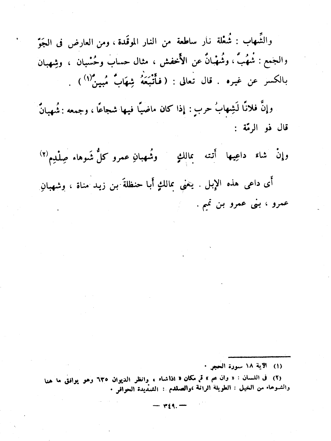والشِّهاب: شُعْلة نار ساطعة من النار الموقَدة، ومن العارض فى الجَوّ والجمع: شُهُبٌ، وشُهْبانٌ عن الأَخفش، مثال حساب وحُسْبان، وشِهبان بالكسر عن غيره. قال تعالى: {فَأَتْبَعَهُ شِهَابٌ مُّبِينٌ} .