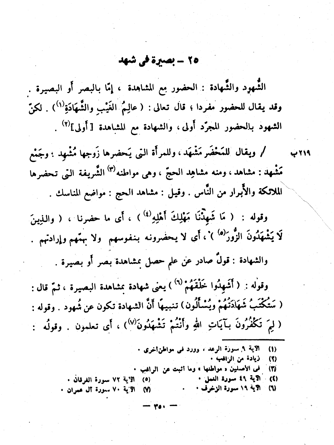 الشُّهود والشَّهادة: الحضور مع المشاهدة، إِمّا بالبصر أَو البصيرة. وقد يقال للحضور مفردا؛ قال تعالى: {عَالِمُ الغيب والشهادة} . لكنّ الشهود بالحضور المجرّد أَولى، والشهادة مع المشاهدة [أَولى] .