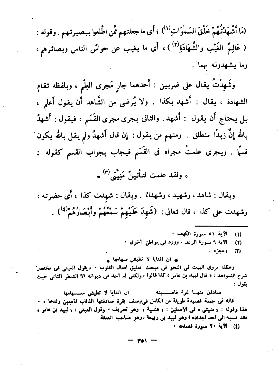 وشَهِدْتُ يقال على ضربين: أَحدهما جارٍ مَجرى العِلْم، وبلفظه تقام الشهادة، يقال: أَشهد بكذا. ولا يُرضى من الشَّاهد أَن يقول أَعلم، بل يحتاج أَن يقول: أَشهد. والثانى يجرى مجرى القَسَم، فيقول: أَشهدُ بالله إِنَّ زيدًا منطلق. ومنهم من يقول: إِن قال أَشهدُ ولم يقل بالله يكون قسمًا. ويجرى علمتُ مجراه فى القَسَم فيجاب بجواب القسم كقوله:
